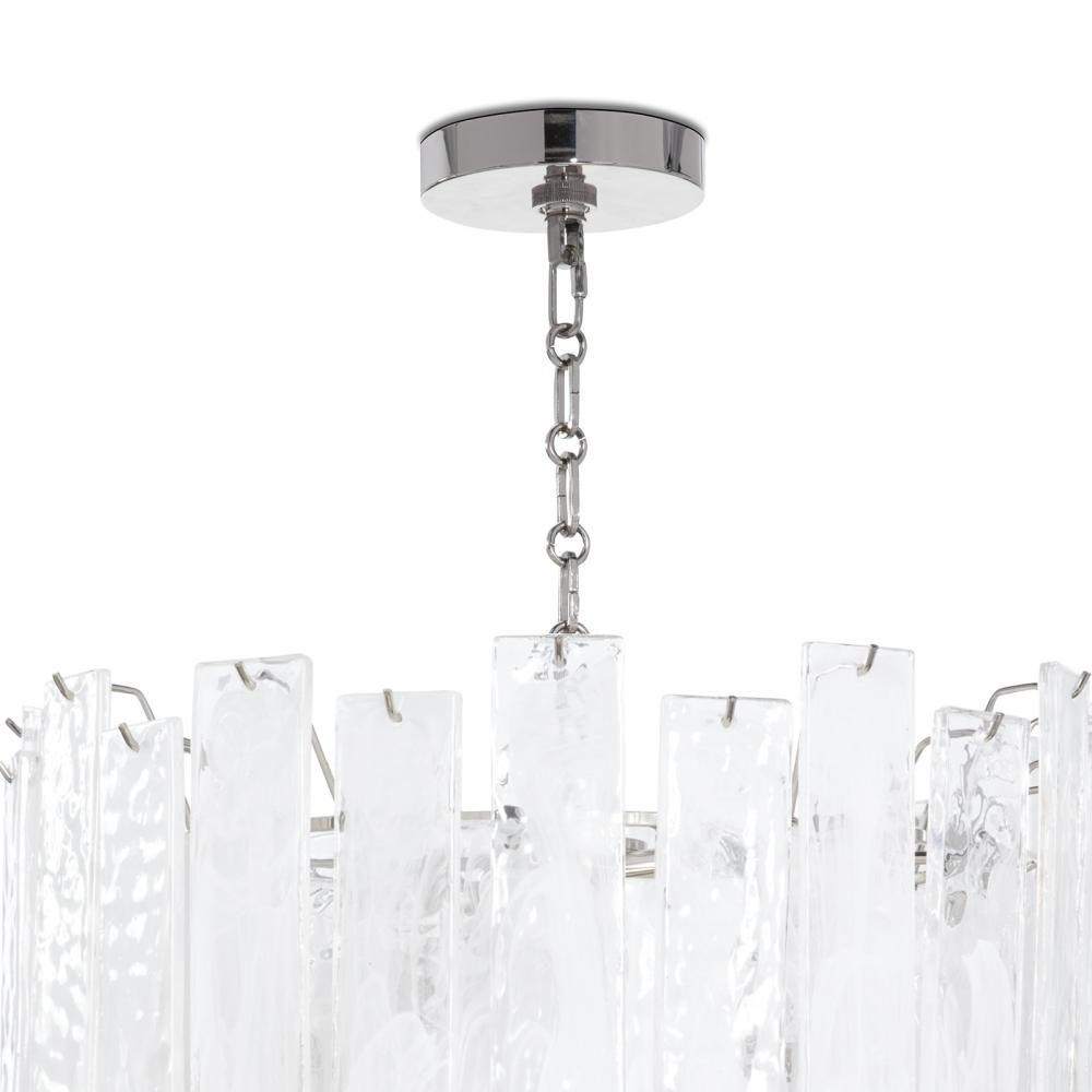 Panes of striking water glass with white swirls adorn the small Glacier chandelier to create a dynamic piece full of movement. The glass diffuses the light, providing a soft glow to the area around it, perfect for a foyer or living room.