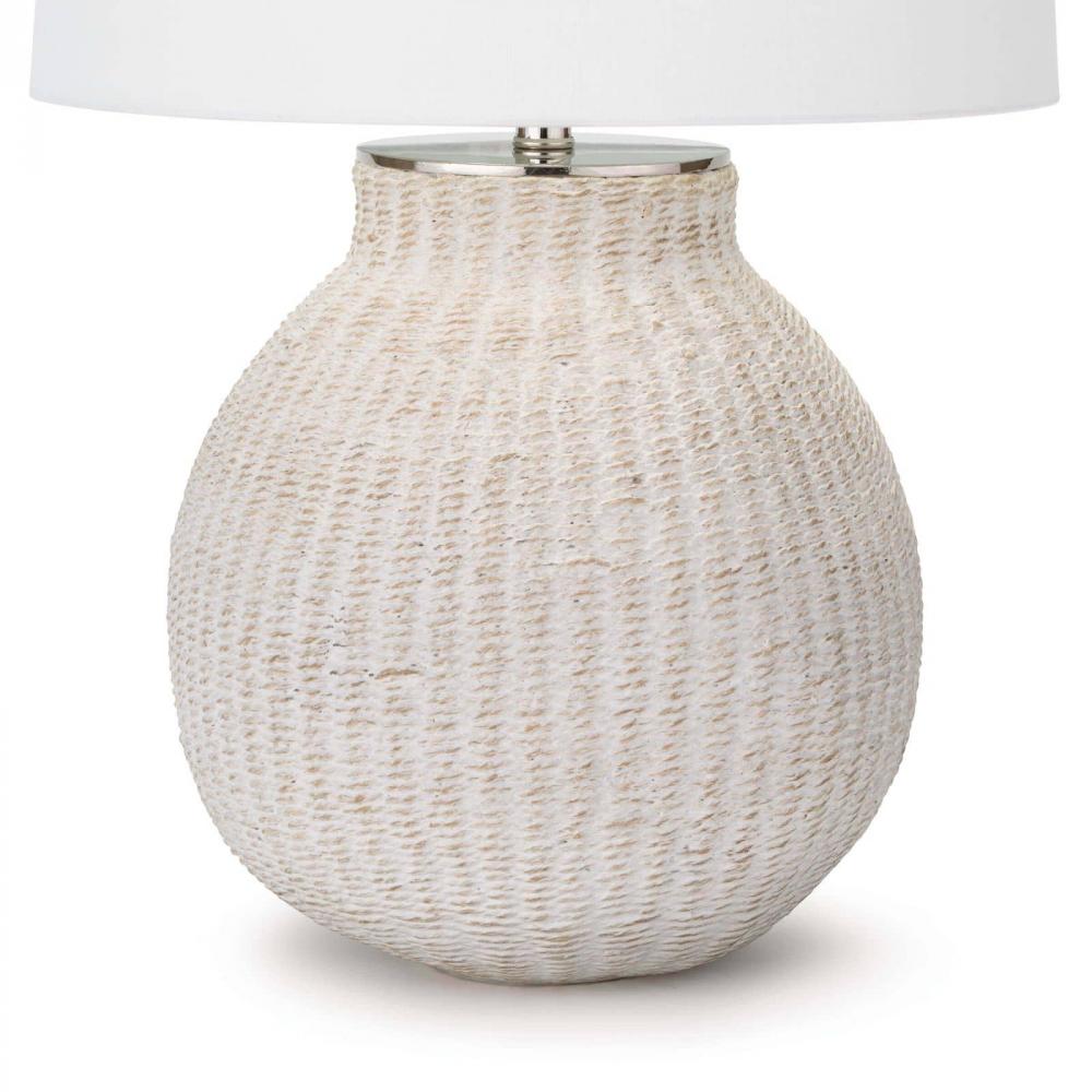 A white-washed natural woven pattern highlights this lamp's unique body shape. The Hobi's perfect mix of organic charm and polished nickel detailing creates a casual elegance perfect for a coastal retreat.