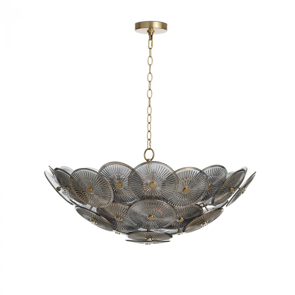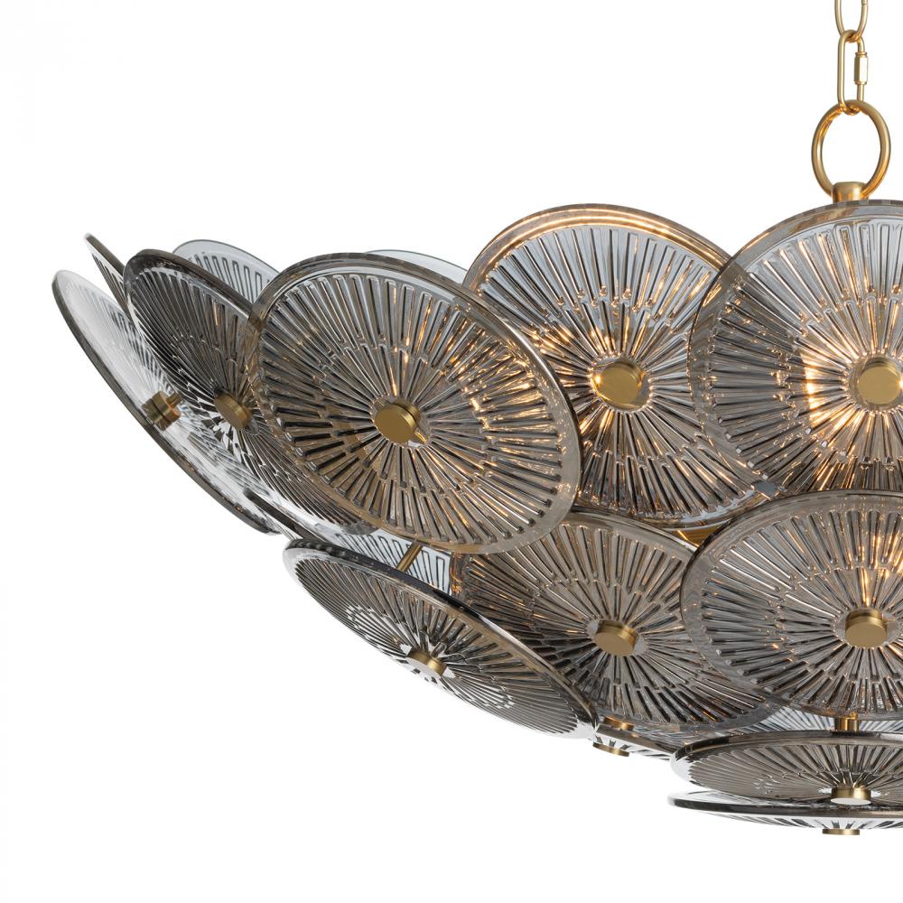 The Holly chandelier is captivating, featuring overlapping glass discs with intricate linear details reminiscent of vintage ceiling medallions while suspended on a natural brass chain. The medallions feature dotted natural brass finials for a modern, opulent touch.