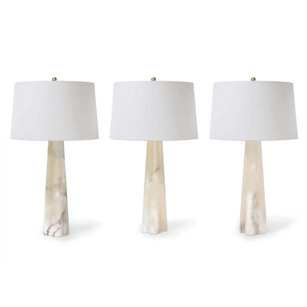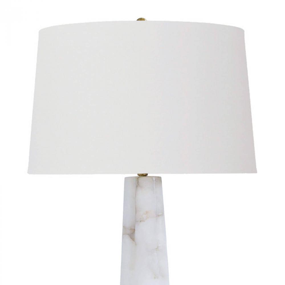 Unusually lightly colored, translucent, and soft stone, alabaster has been used throughout history primarily for carving decorative artifacts. A tapered alabaster base juxtaposed with a traditional drum shade makes this lamp a beautifully well-balanced source of light and style.