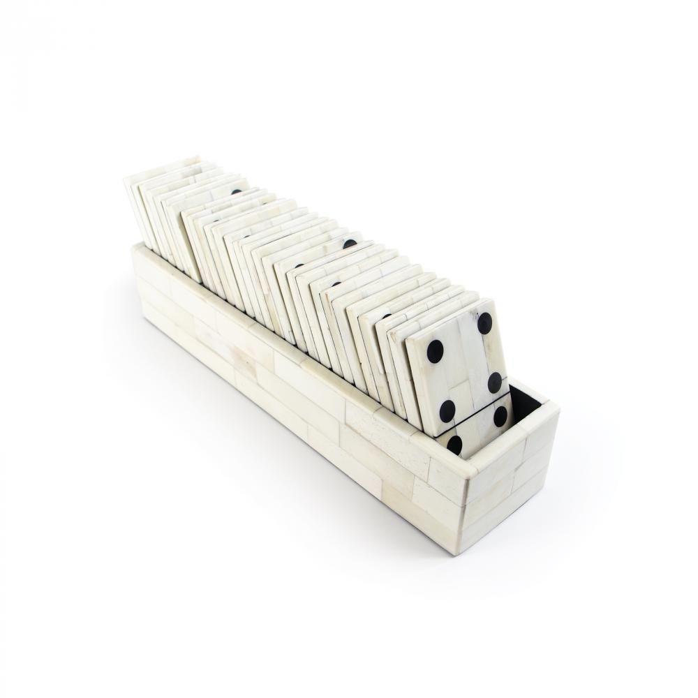 A beautiful piece of functional decor, this Domino Set is anything but ordinary. The domino pieces are real, white bone with black dots and their case is made from fragments of bone that have been shaped into tiles and inlaid by hand to create a rich mosaic look. Place on a side table, coffee table, or bar top for decor that also functions as a classic game to thrill guests.