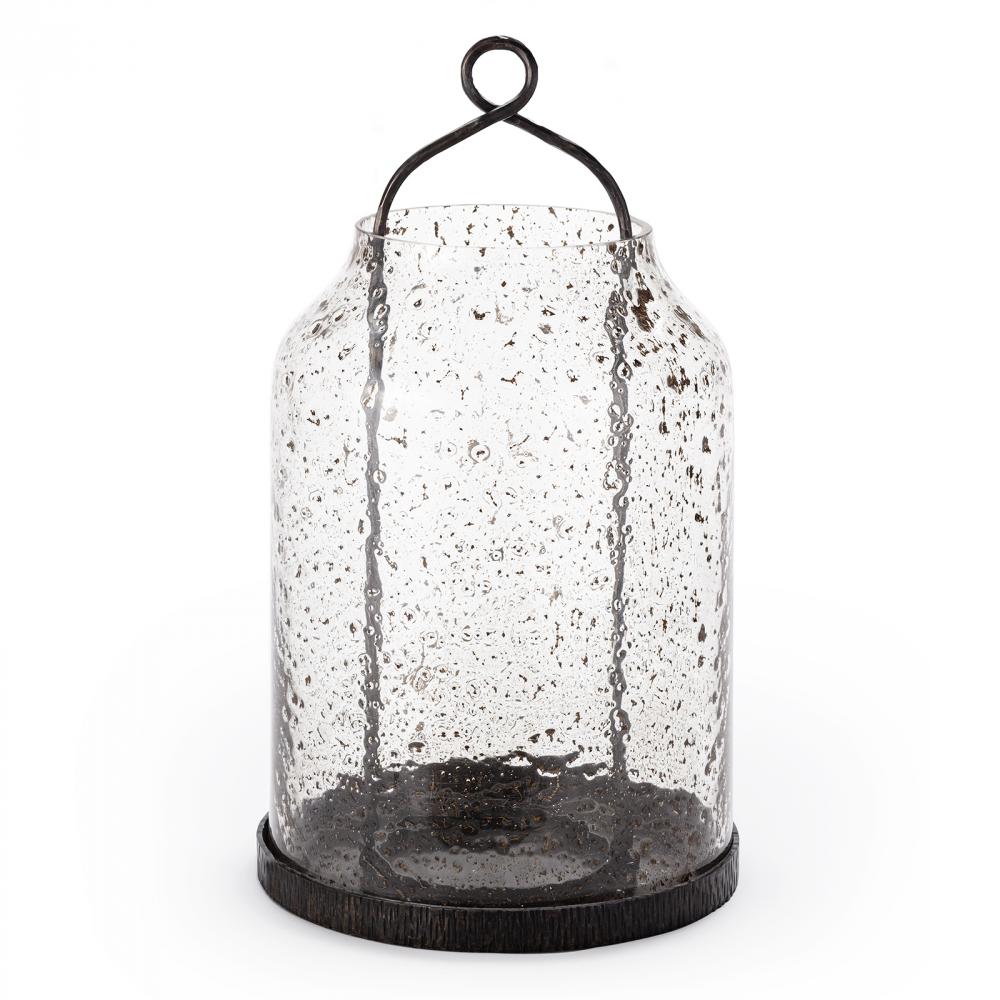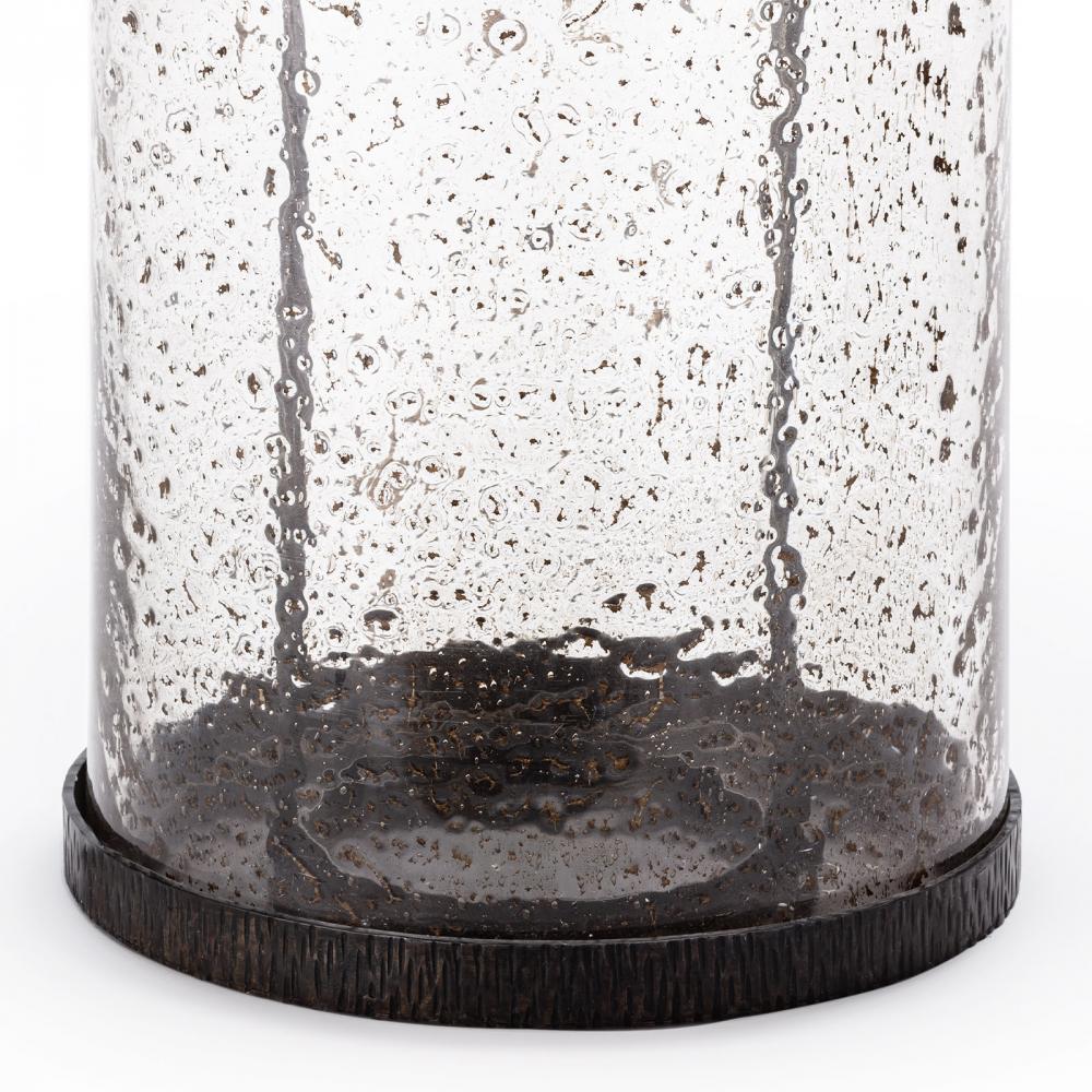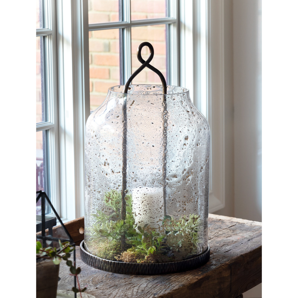 The Scout Hurricane adds an organic addition to any tabletop. Scout features hand-blown glass with a pitted finish, as well as blacksmith-quality metalwork finished in a bronze patina. This multi-purpose Hurricane has a practical handle incorporated into the design for easy moving- so try it anywhere you need a little glow.