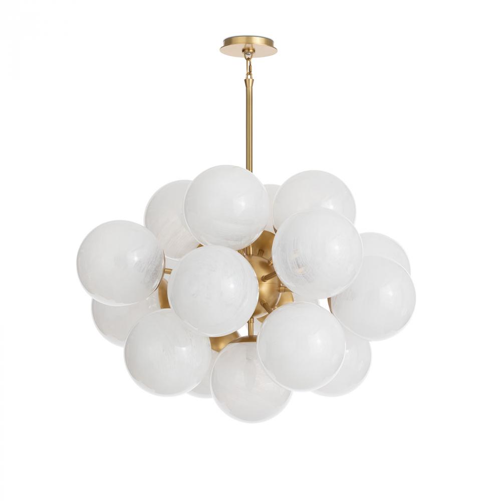 The Shine Chandelier is a beacon of joy, evoking the whimsy of a cluster of balloons with a nod to mid-century modern aesthetics. Shine's captivating white swirled glass globes offer a dramatic 60s or 70s vibe set in a natural brass frame. The chandelier transcends mere functionality, elevating any room with its striking presence.
