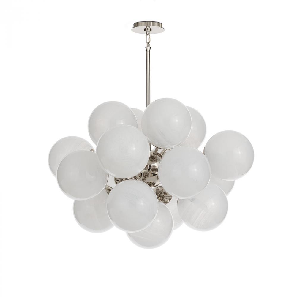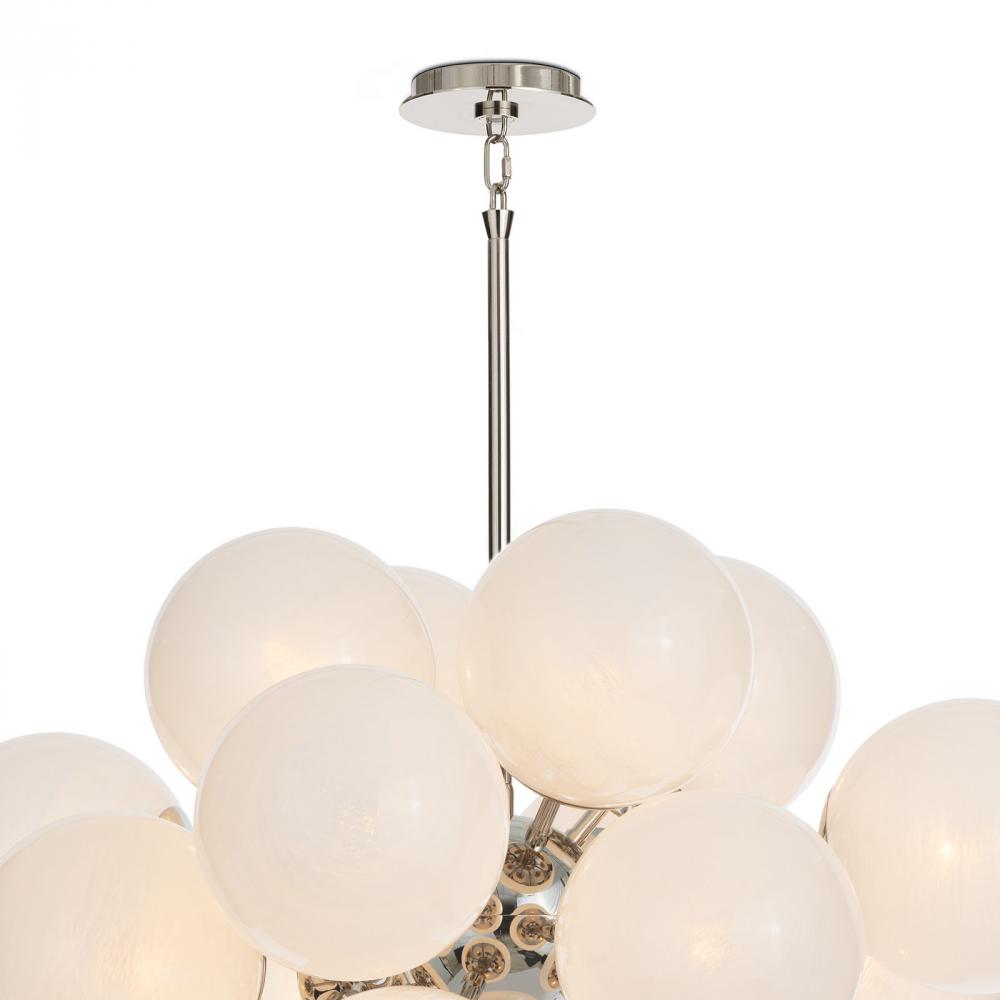 The Shine Chandelier is a beacon of joy, evoking the whimsy of a cluster of balloons with a nod to mid-century modern aesthetics. Shine's captivating white swirled glass globes offer a dramatic 60s or 70s vibe set in a polished nickel frame. The chandelier transcends mere functionality, elevating any room with its striking presence.