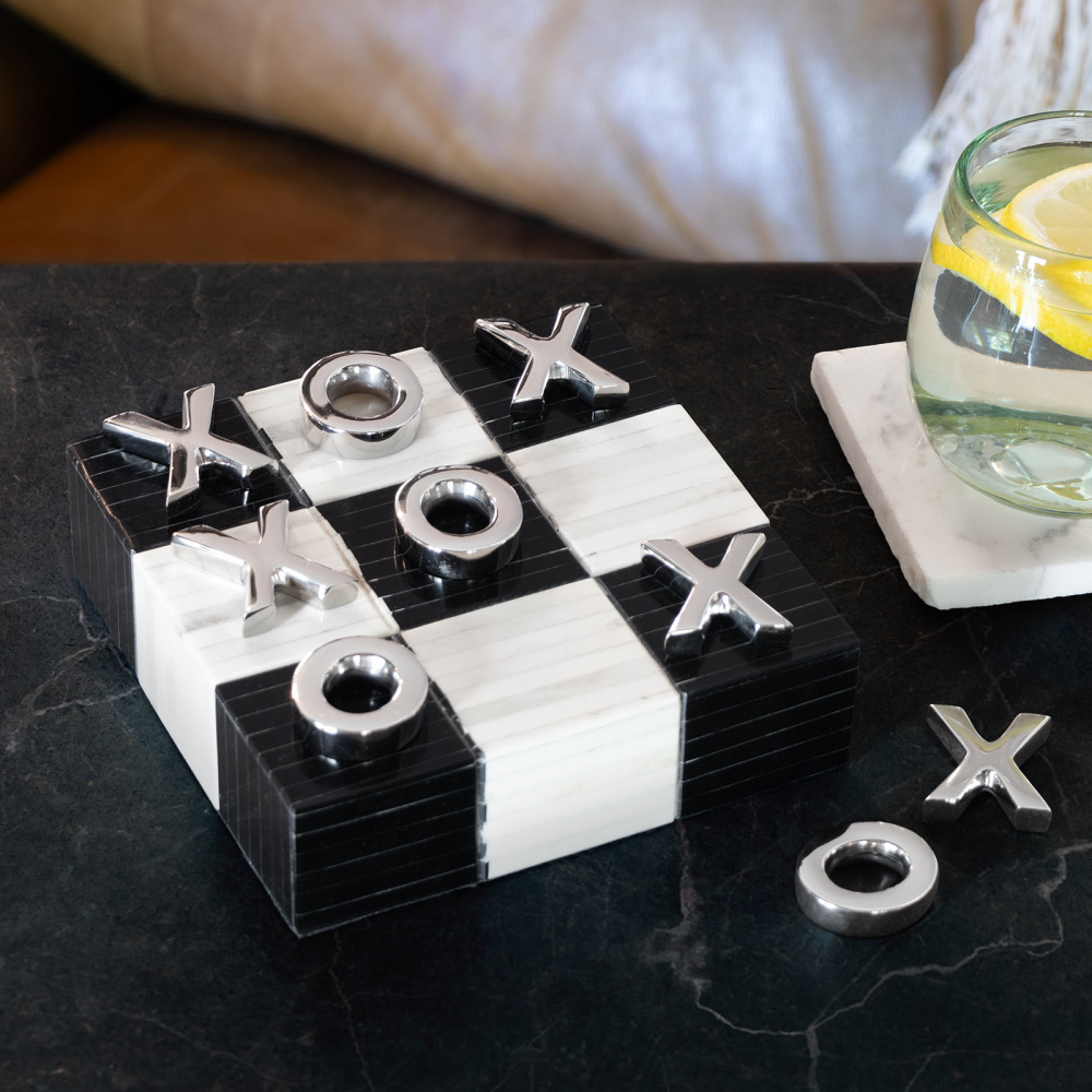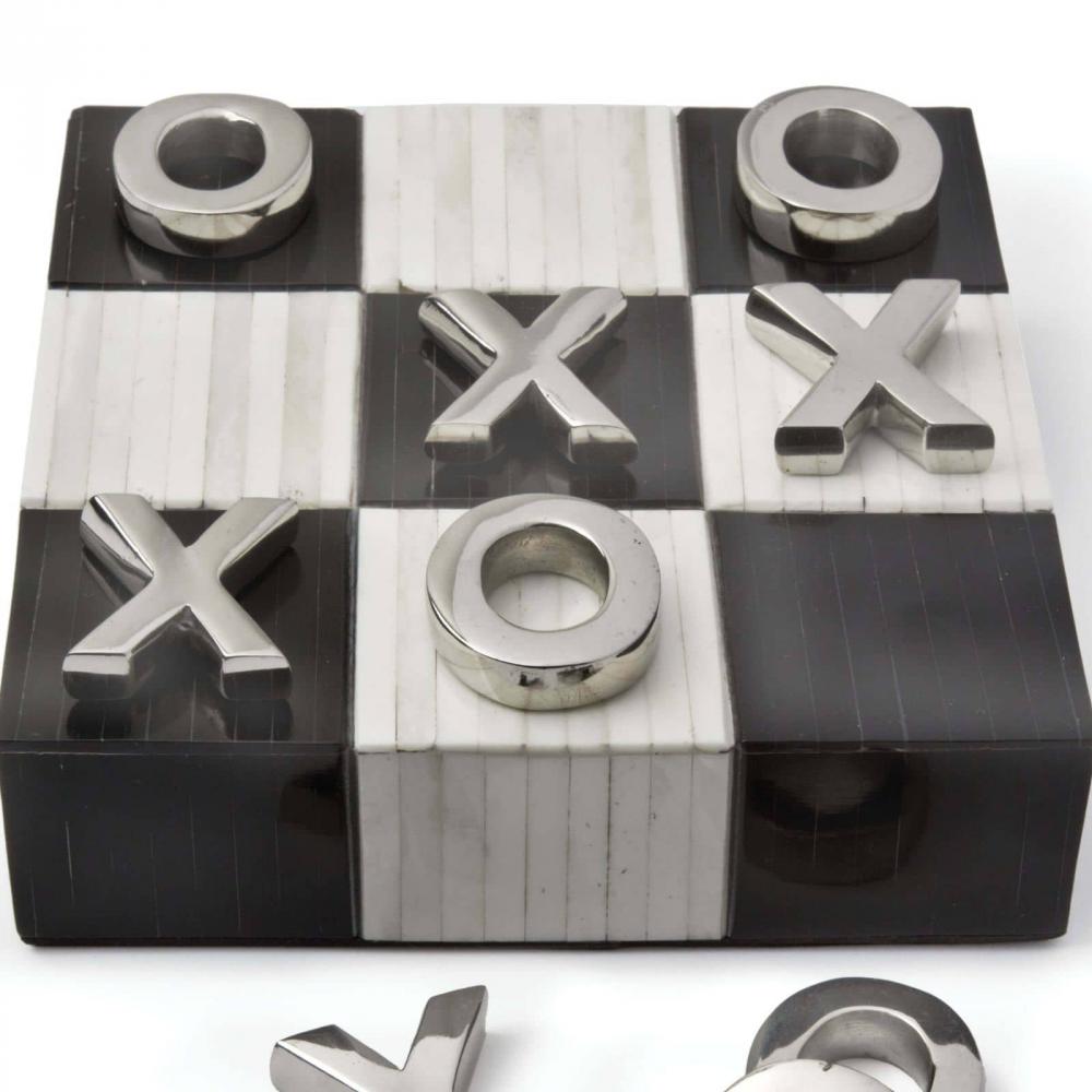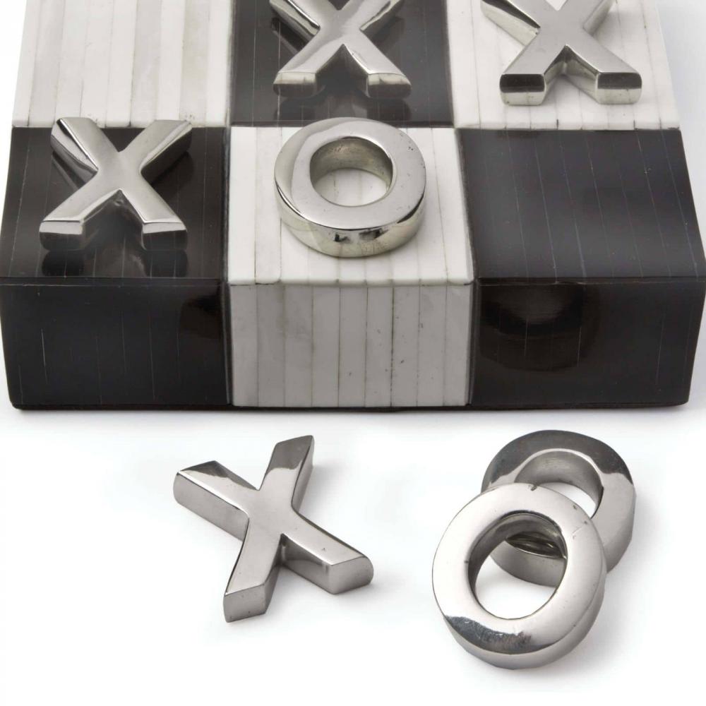 A classic game turned décor. This stylish and functional Tic Tac Toe game is played with polished nickel X’s and O’s on a black and white, checkered pattern bone board.