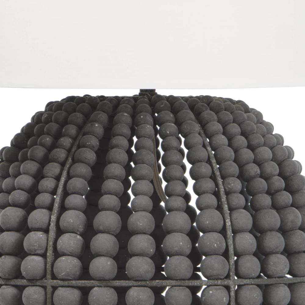 Coastal style meets modern charm with the Tropez table lamp. A bevy of distressed, charcoal grey wooden beads, draped around a steel structure, brings out an earthy glamour to a living room, dining room, or bedroom.