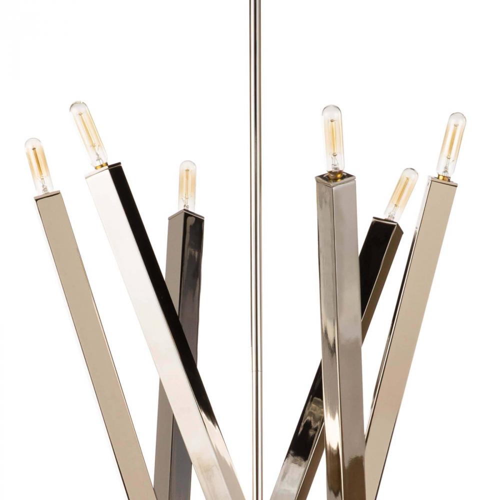Contemporary cool: Sleek metal rods seemingly balance in the air. Clean lines and subtle design details come together making this chandelier not only handsome but versatile. The Viper's design ingenuity is showcased in the arms which can be positioned vertically, horizontally, or configured into a random pattern. Customize your design style even further with decorative light bulbs. Consider white frosted globe bulbs for a Mid Century vibe or go dark and moody with vintage T bulbs.