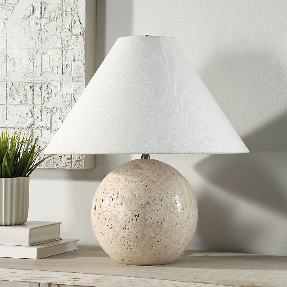 The Assen table lamp is set to become the fashionable sidekick your room update has been waiting for. Blending form and function, it features a stunning honed travertine base in tones of cream that complements many styles of interior. The perfect bedroom or living room table lamp, its generously sized tapered cream linen shade is held up by a champagne plated fitting that when combined with its included bulb, shed a warm glow throughout the room. Beautiful on its own or paired up for double duty, this dimmable lamp will make a timeless and memorable statement in any space.