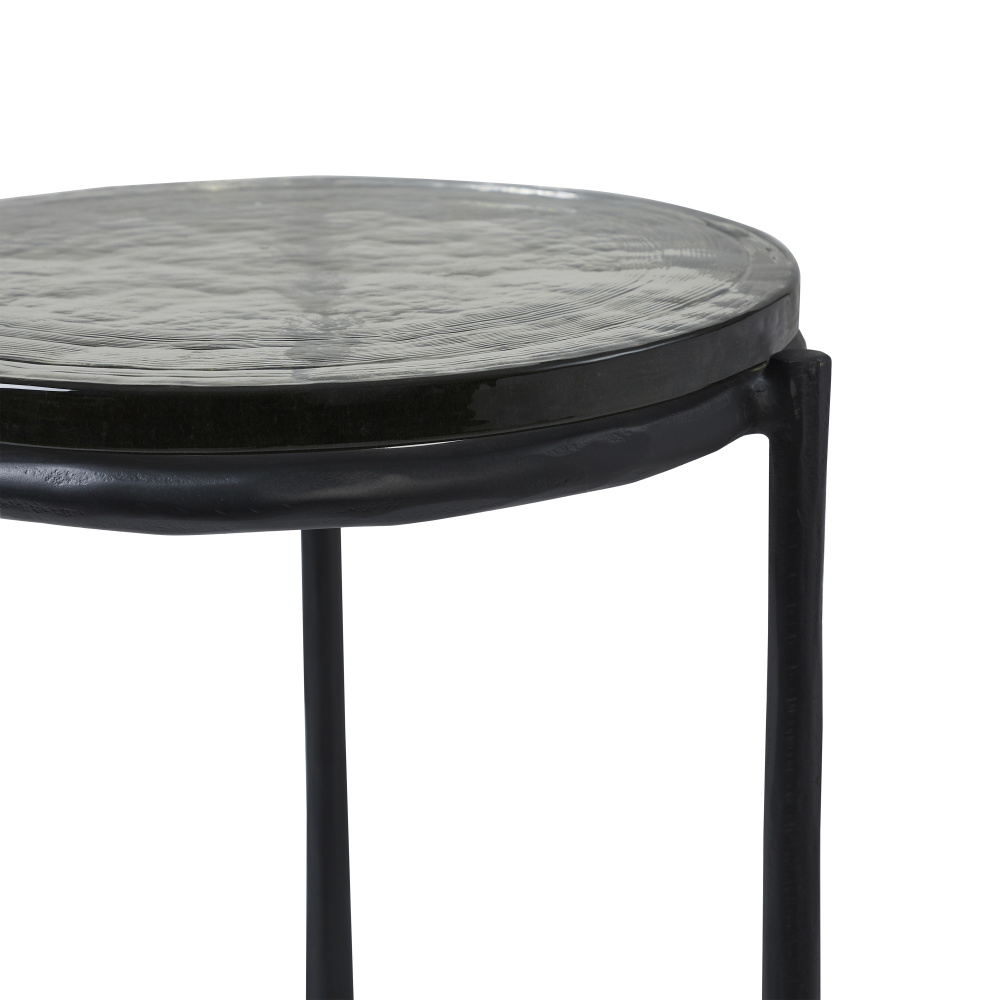 Whether decorating a room from scratch or just looking to inject a fresh new touch, the Avila side table has just what you need. Clean lines and classic materials team up to create a stunning accent end table that’s perfect for many styles of interiors. Sleek and sturdy cast aluminum is treated to a black plated finish and capped off with a smooth recycled tinted glass tabletop. Its three-legged design provides stability while ensuring a great-looking airy feel. Placed next to a lounge chair to create a cozy reading spot, or sofa-side as a living room accent table, this end table is ready to deliver style and convenience to your decorating project.