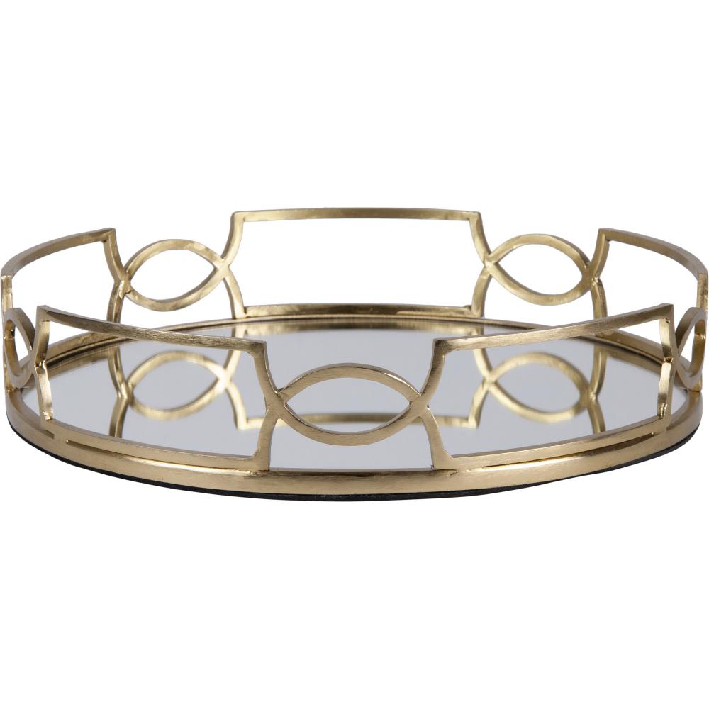 Intertwining function and formality, this tray design is just as powerful when set as a décor piece as it is in use. Featuring an iron antique brass-plated framework with a mirror in its center, it glistens and glows from every angle. With a 12-inch diameter it provides ample space for drinks or a display.