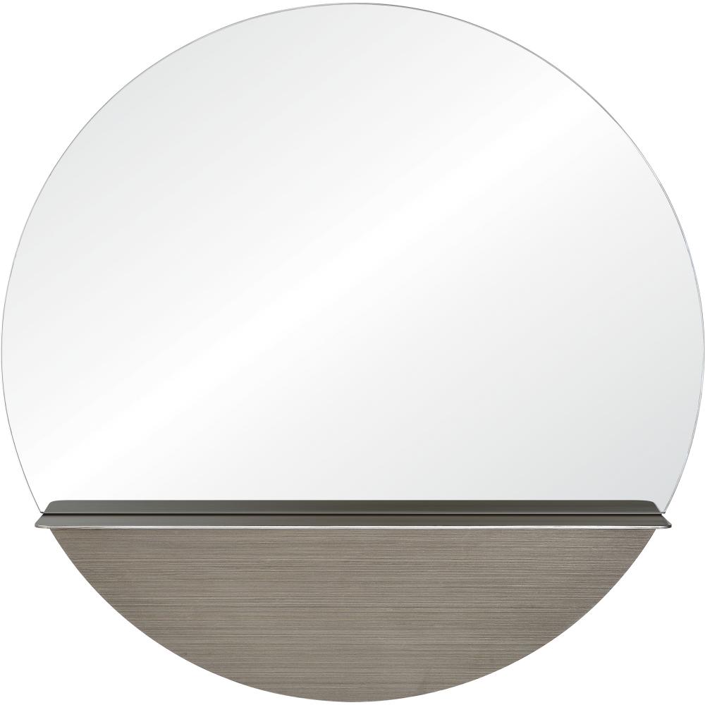 This round-shaped mirror takes the contemporary bathroom or entryway from ordinary to extraordinary. The textures and variety in the materials of glass, metal, and wood means its varying highlights and lowlights enhance its appeal. The shelf addition provides a place for essentials to rest while the mirror itself is large enough to get a full picture.