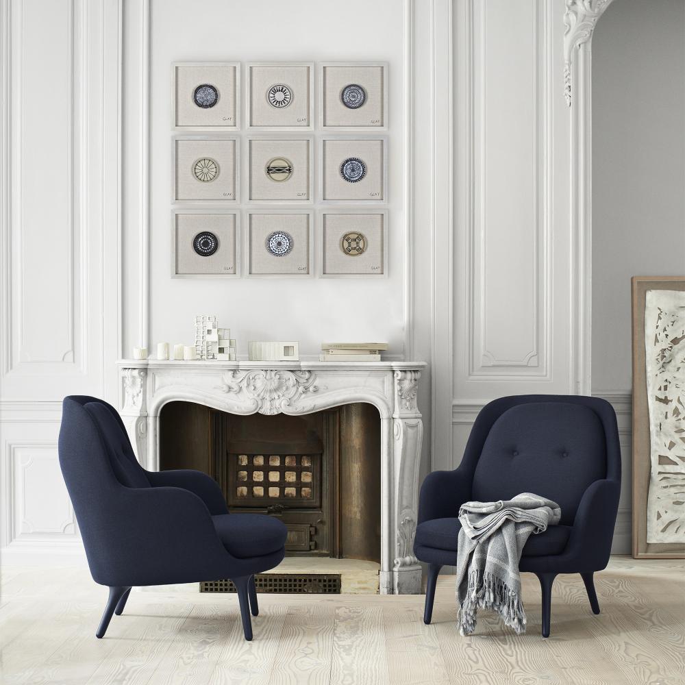 Contemporary and crafty, this traditional wall decoration evokes the native beauty of aboriginal pottery. Each clay plate features its own distinctive design in assorted combinations of beige, white, blue and black. The collection is delicately mounted to a linen background for a touch of texture and surrounded by an oak wood frame.