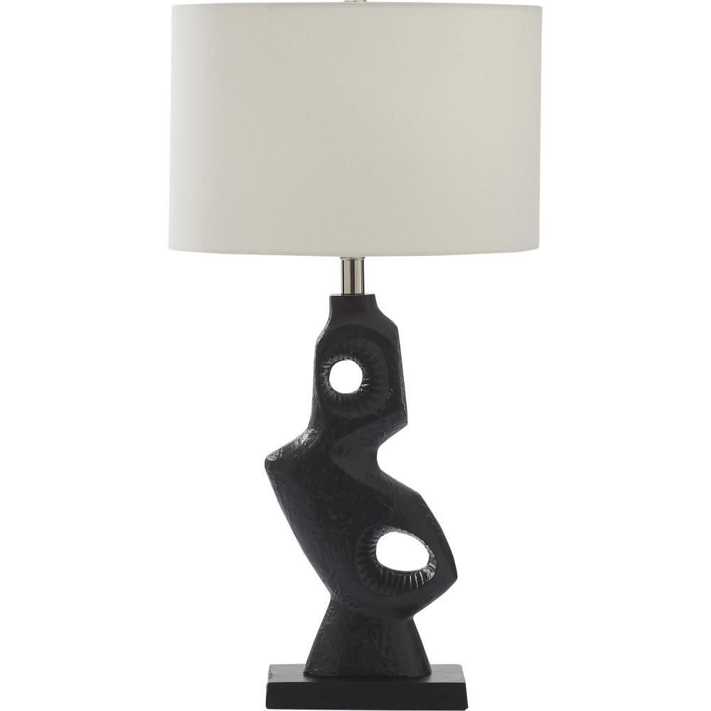 The eye is instantly drawn to this table lamp, thanks to its abstract architectural structure. This unique piece showcases the unique angles of the design. A black powder-coated aluminum base and off-white cotton shade provide a minimalist palette so its creative influence can be the focus.