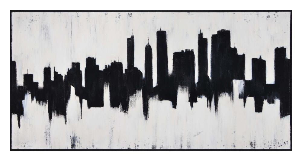 Rhythmic brushstrokes reveal the rising architecture of this decorative painting on canvas. The bold composition uses sharp contrast to convey emotion, as strong black lines shape the shifting silhouette of the city skyline and divides the center of the horizontal canvas into earth and horizon. Surrounded by a black frame, this modern canvas art piece adds a striking signature style to interior walls in town or country.