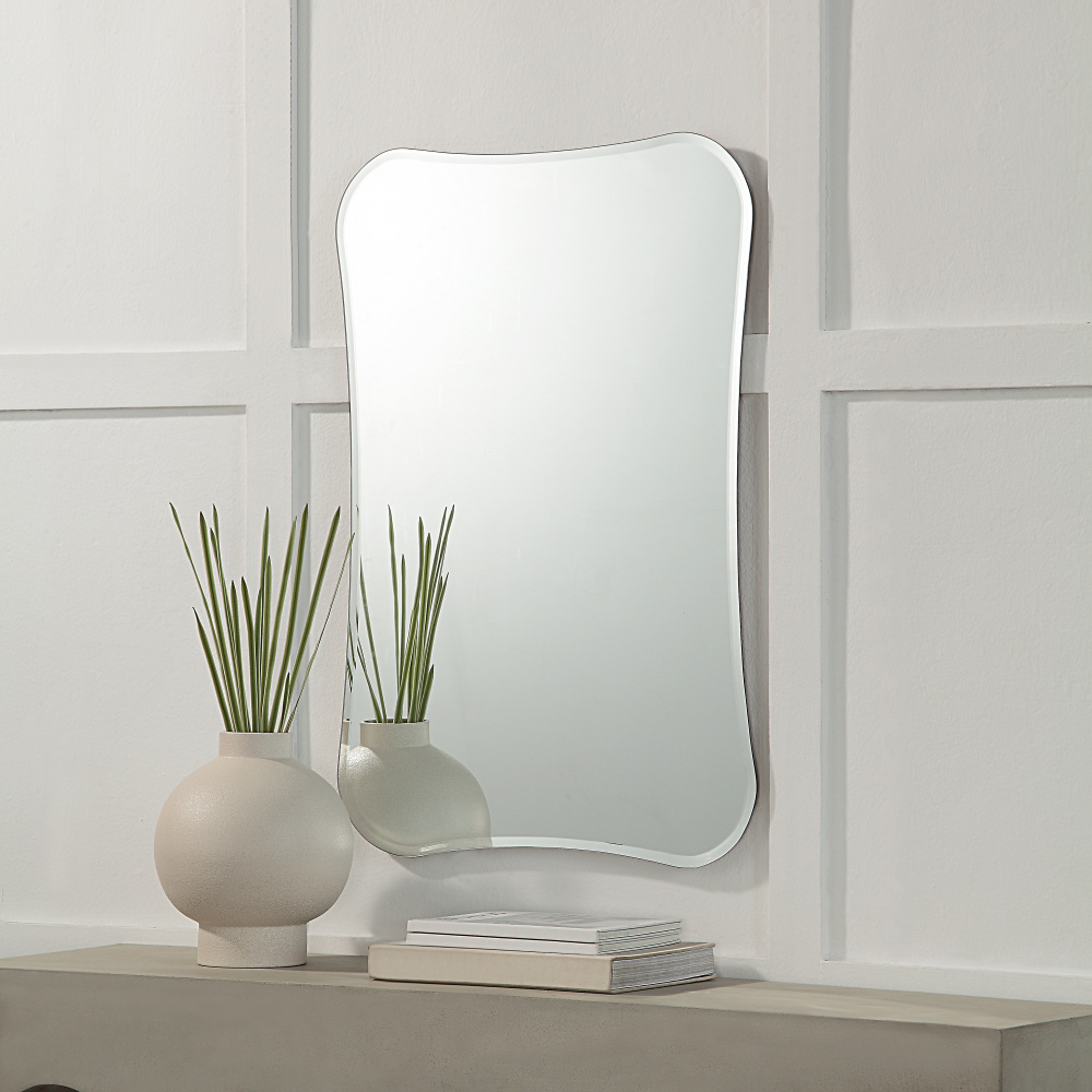 Upgrade your space with the Kalmia 36" Tall Rectangular Irregular Mirror. Its abstract shape adds a touch of modern flair to any room while its low-maintenance design makes it incredibly easy to clean. Equipped with a D-Ring hanging system, this mirror can be installed quickly and easily. With its sleek and elegant design, this mirror will instantly elevate the look of any room. The unique irregular shape adds a touch of visual interest, while the tall size allows for a full-body reflection. Additionally, the four-way hanging system allows for versatile display options, ensuring that you can get the perfect look for your space.