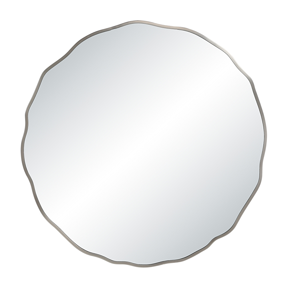 Bring whimsy and style to any interior with this irregularly shaped round wall mirror. Measuring 40” in diameter, it’s perfectly sized for displaying above a fireplace, entry table or dining room credenza. A brushed nickel frame provides durability and high-quality mirror glass ensures a distortion-free reflection for years of use.