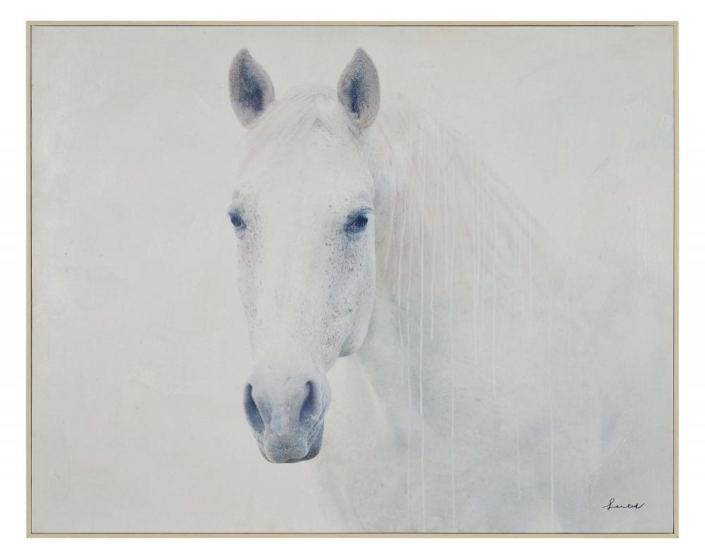 Within the hand-painted streaks of this traditional canvas art piece, a white horse emerges from the pale. The photographic print uses every shade of the cool color palette to capture the horse’s gentle expression in frosty tones of blue, white and gray. A gray L-shaped frame complements the classic design of the wall decoration, bringing a touch of farmhouse style to this gallery-worthy artwork.