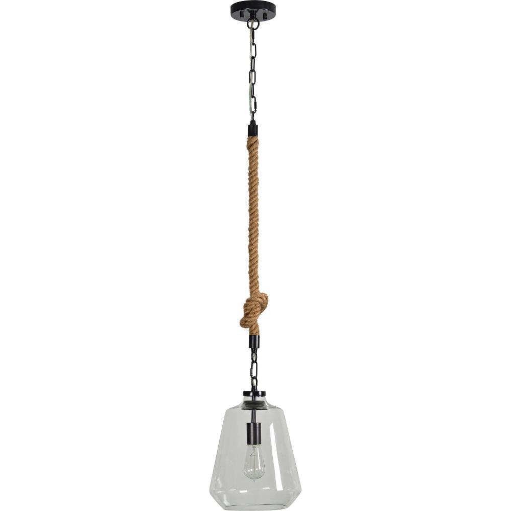 The knotted twine of twisted rope serves as the decorative downrod for this traditional ceiling pendant light. Suspended from the ceiling by an iron chain, oil-rubbed bronze accents complement the rustic style of the ceiling light fixture. A clear glass bell-shaped shade reveals the glowing filament of a vintage reproduction Edison light bulb.