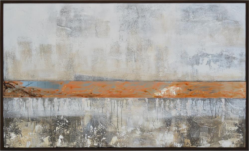 A heavy texture and a mirror accent give great impact to this piece of art. The horizonal rectangular piece makes a statement when hung over a headboard. The dark brown frame pairs nicely with other wooden elements in the room.