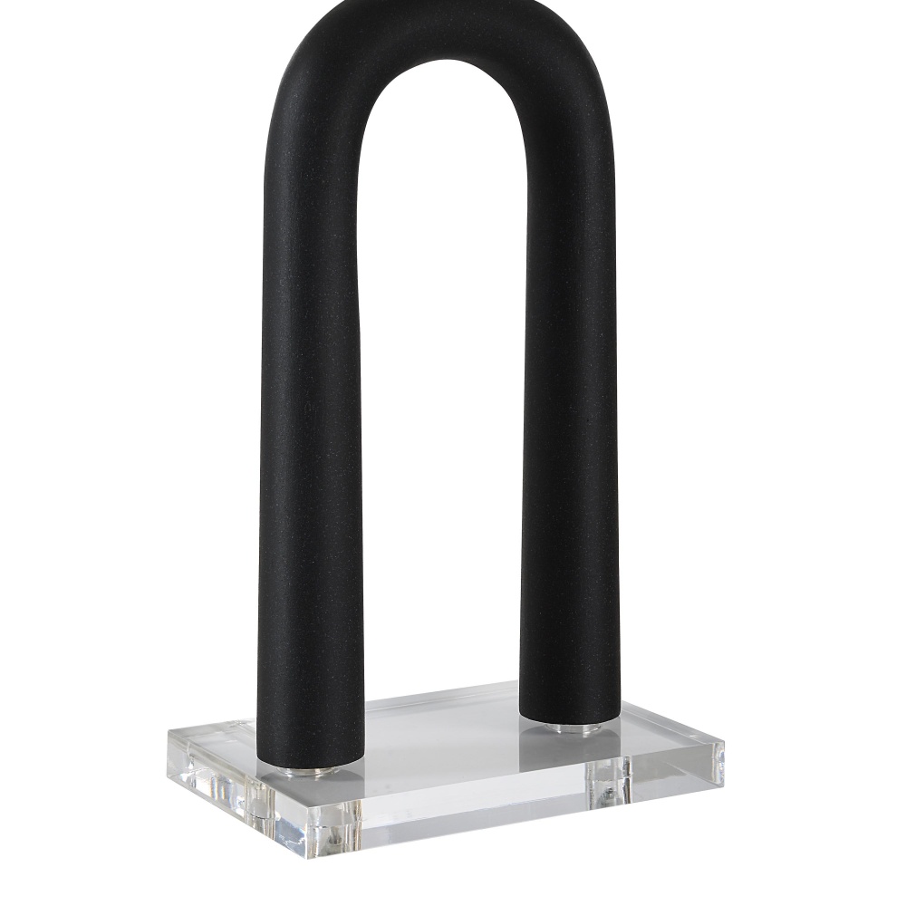 Inject a sculptural touch in any room with the Pisa table lamp. Curvy lines come to life in its arched matte black body that sits upon a crystal-clear base and topped off with a classic ivory linen drum shade. Just the piece to light up any home or office, picture one or a pair casting an ambient glow in a bedroom, living room, dining room or anywhere else in need of illumination and a stylish update.
