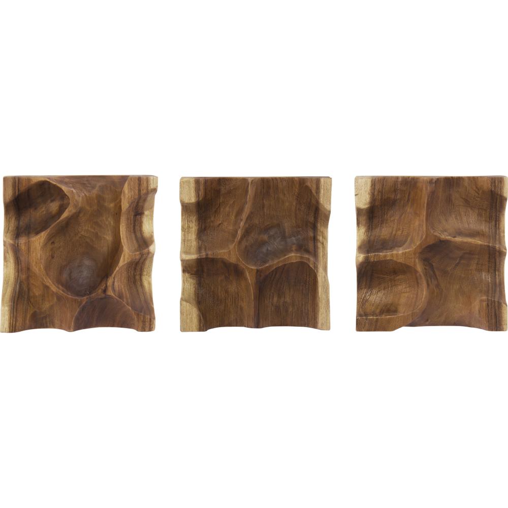 Suar wood elegantly toes the line between rustic inspiration and luxe design. The three pieces in the set are equal in size but completely separate in style, with their own palette and personality on full display. Hanging within the hallway, living room or office space, the set can hold focus or highlight the elements within its vicinity.