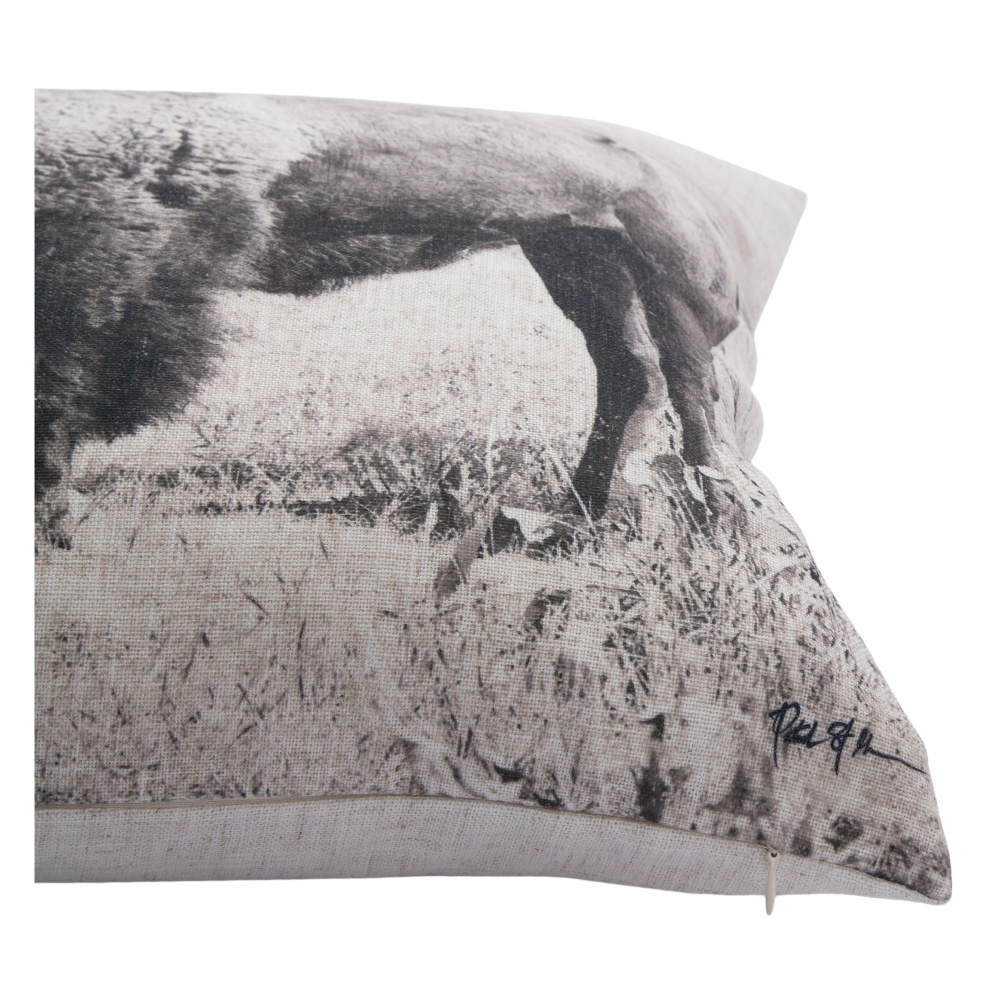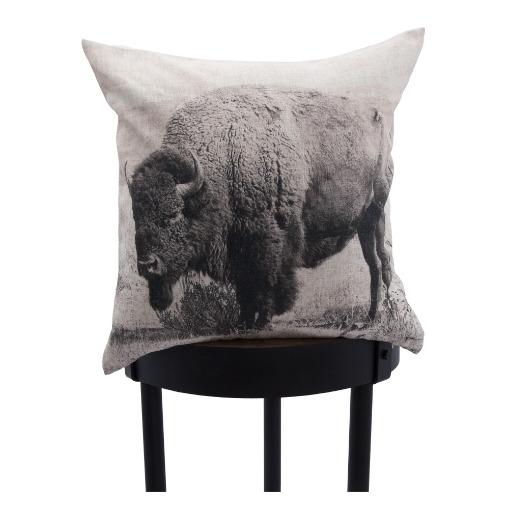 Compose a chic pillowscape on couches and beds with the traditional style of this decorative pillow. Printed in graphic detail on a square pillowcase, shades of gray capture the imposing presence of a wild buffalo with a rustic design and photorealistic quality that turns an ordinary cushion into a captivating work of art. A sumptuous combination of duck feathers and down fill the standard pillow sham with enduring softness, offering comfortable cushioning for every seating or sleeping arrangement.
