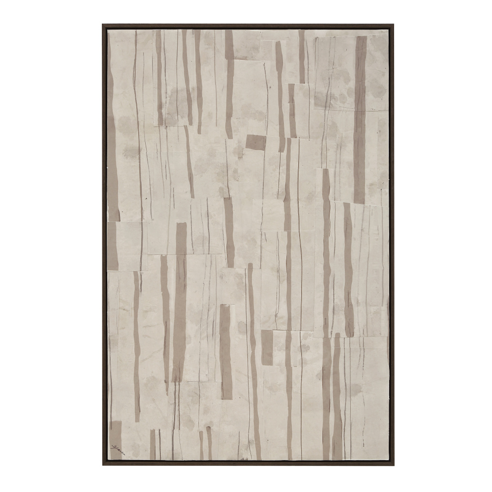 Steven Sabados lends his modern design sensibility to this stunning wall art canvas that will make a statement in any interior. The Canadian designer and television host conceptualized this hand-painted and printed piece with a heavy paper collage technique, balancing neutral tones and texture. Framed in black oak, this modern art is ready to hang.