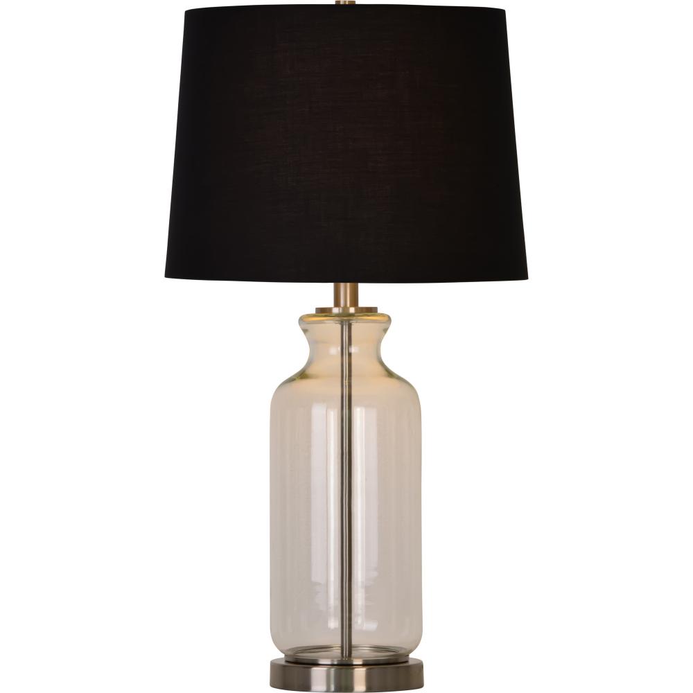 A pair of table lamps to adorn your living room tables. This sophisticated design features a clear glass base with a satin nickel-plated iron structure. The black cotton shade gives impact to this otherwise unobtrusive design.