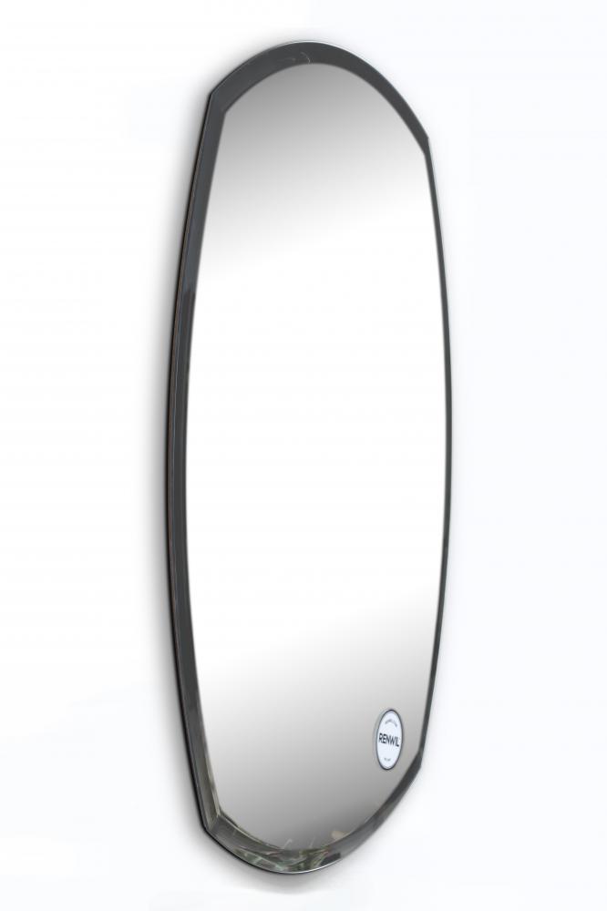 This contemporary mirror has a unique shape that would have a great designer effect in a bathroom. It has beveled and polished edges. The mirror is attached to a backing with strong hangers.