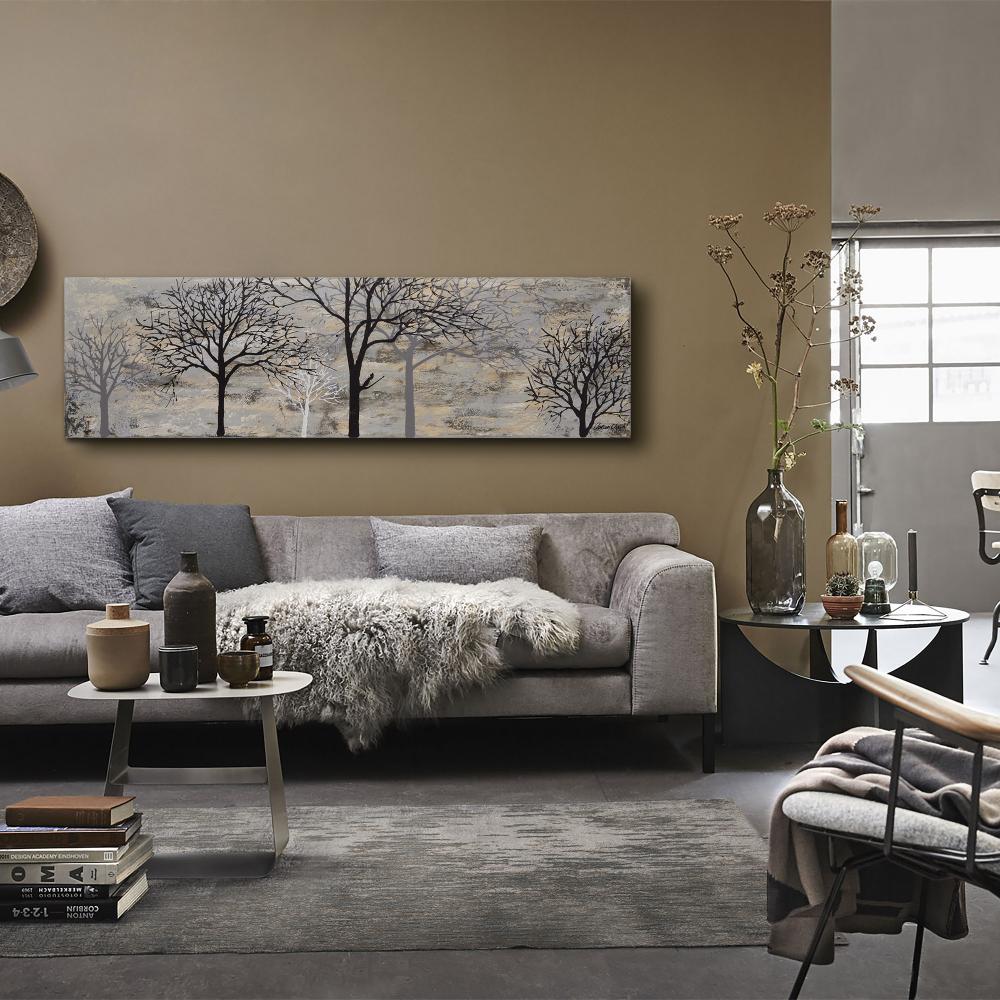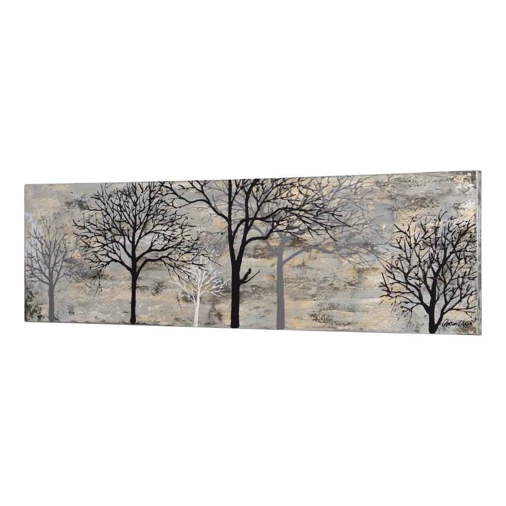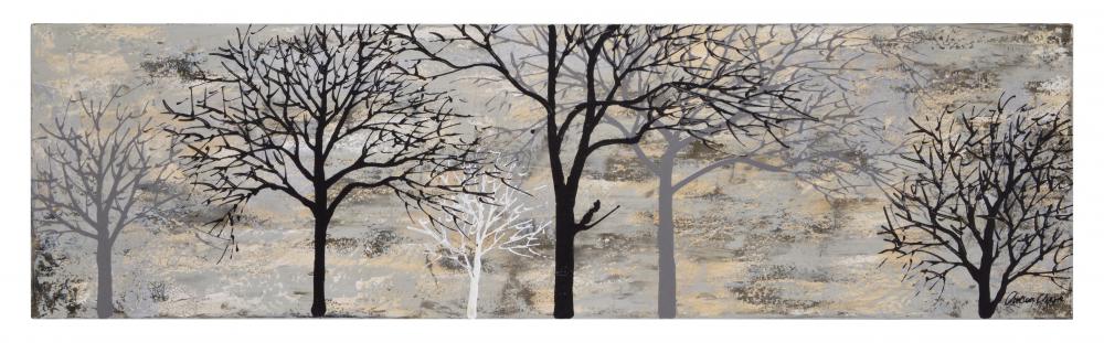 The eye of the storm touches down in the textures of this traditional painting on canvas. A stippled gray and beige sky surround hand-painted branches of black, gray and white trees that lean in the force of the winds. The panoramic format seemingly extends the proportions of a wall and creates a rustic vibe over a leather couch or cobblestone fireplace.