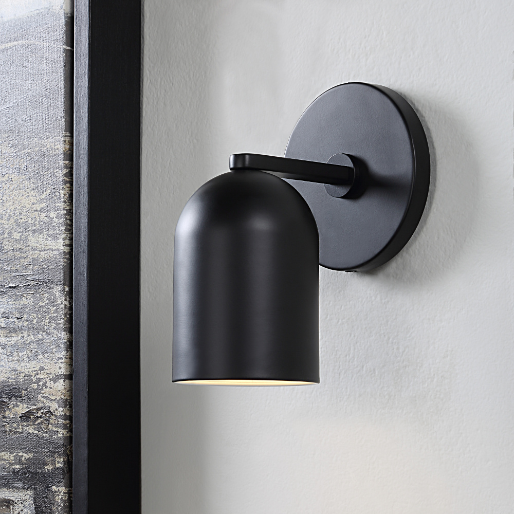 Can lighting be understated and statement making at the same time? One look at the Valonia light wall sconce and you’ll know the answer is yes. Delivering ambient lighting and constructed with a minimalist dome-shaped shade suspended from a clean-lined mounting plate, this fixture has a sleek powder-coated matte black finish that punctuates a room with great taste. Whether featured on its own or paired up for twice the impact, it offers hardwired installation with no visible wiring, so nothing gets in the way of the clean look. As at home in a Scandinavian-inspired setting as it is in a space with a vintage vibe, this modern wall sconce is a style savvy addition to any home.