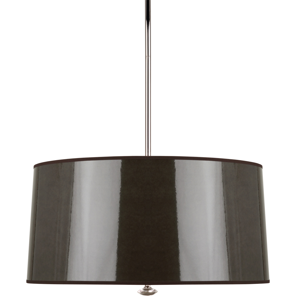 The Penelope collection draws the eye by combining polished metal, vibrant color choices, and graceful tapers. These pieces are sure to add both sophistication and visual appeal to your space. - Polished Nickel Finish Penelope Pendant with Taupe Ceramik Parchment Shade with Silver Mylar Lining