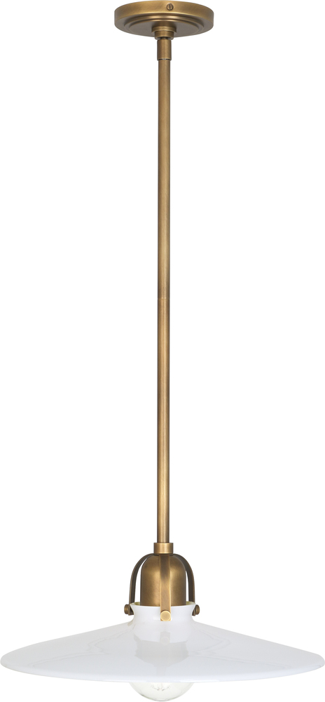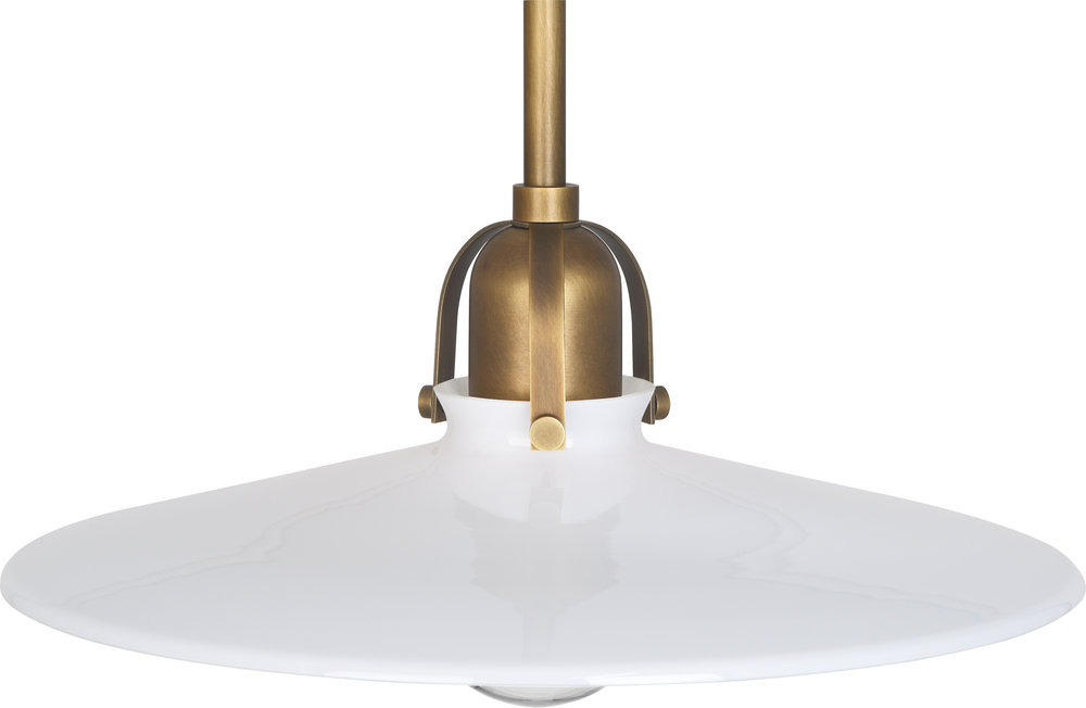 Minimal and ethereal, the Arial collection has a touch of industrial style that you will love. Sleek metal arms and knurled turn knobs provide interesting accents to the shallow frosted glass shade. These pieces are versatile and contemporary. - Warm Brass Rico Espinet Arial Pendant with White Glass