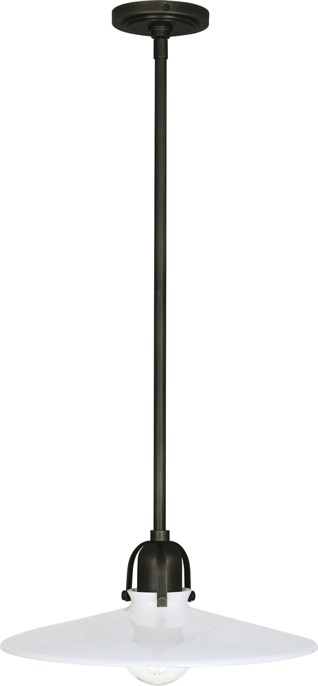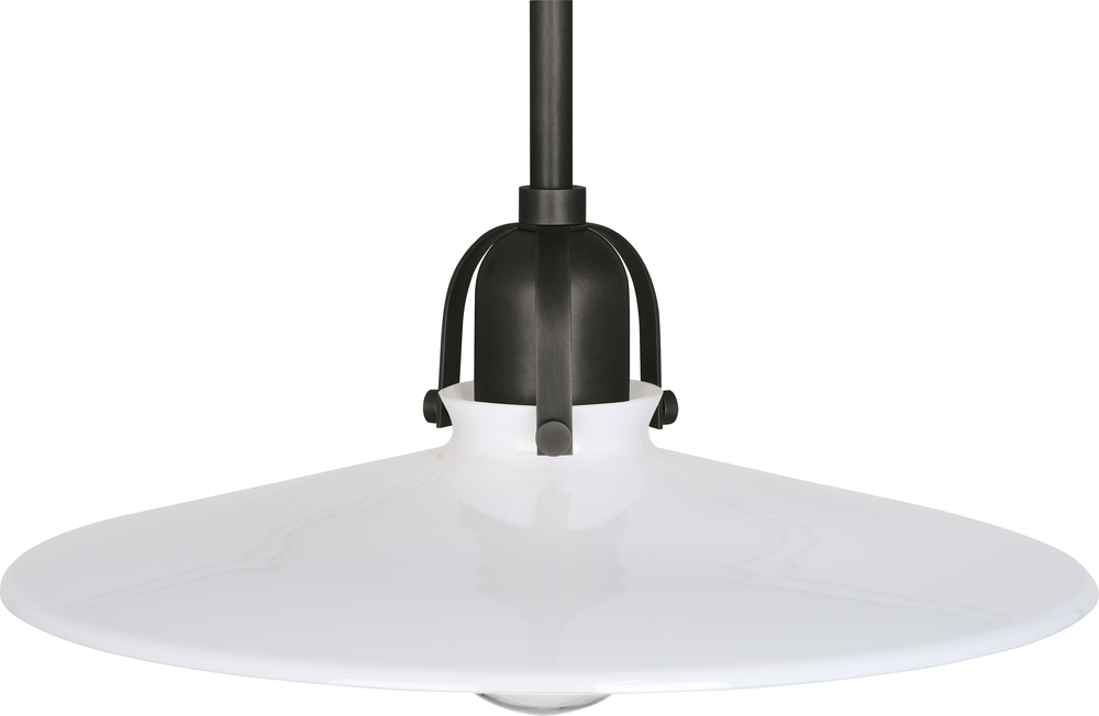 Minimal and ethereal, the Arial collection has a touch of industrial style that you will love. Sleek metal arms and knurled turn knobs provide interesting accents to the shallow frosted glass shade. These pieces are versatile and contemporary. - Deep Patina Bronze Rico Espinet Arial Pendant with White Glass