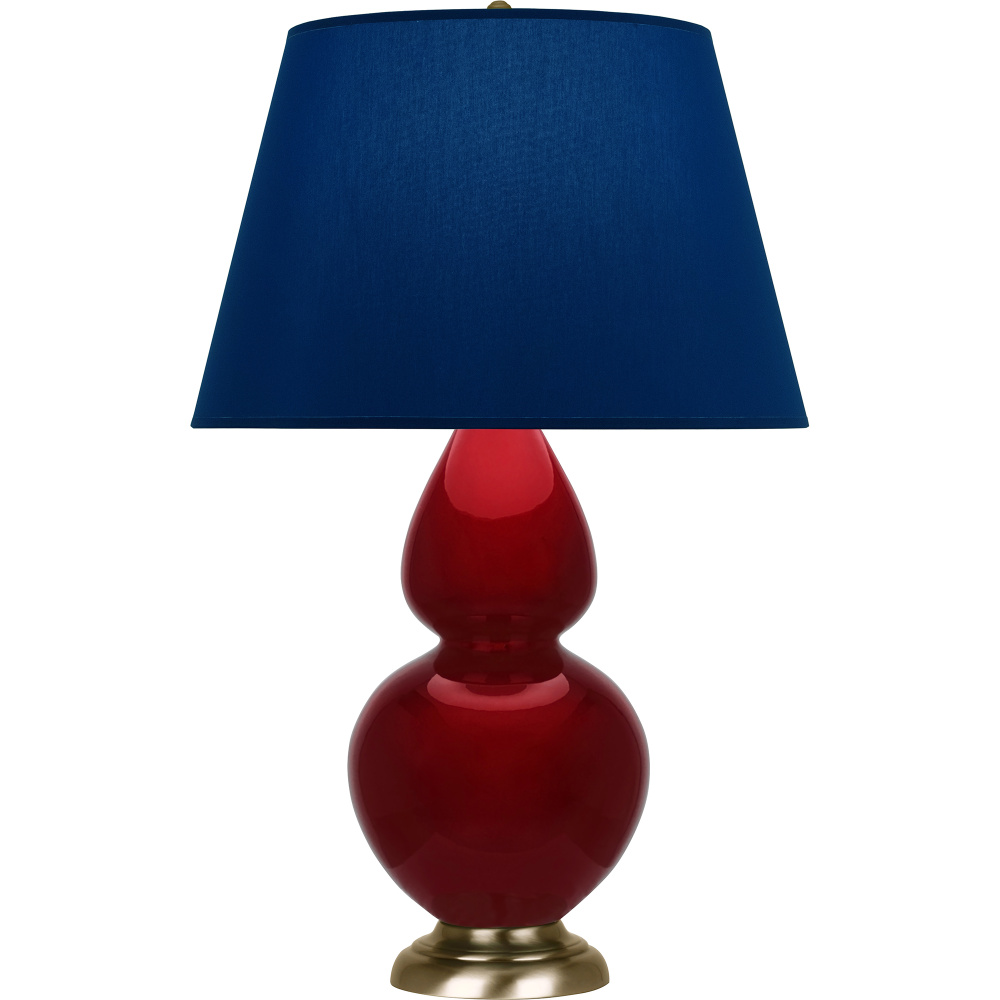 Sangria Glazed Ceramic with Antique Natural Brass Finished Accents Double Gourd Table Lamp with Navy Fabric Shade with Gray Lining - Our Double Gourd collection features a simple but gracefully curving silhouette. Available in a wide array of vibrant colors and several different base finishes.