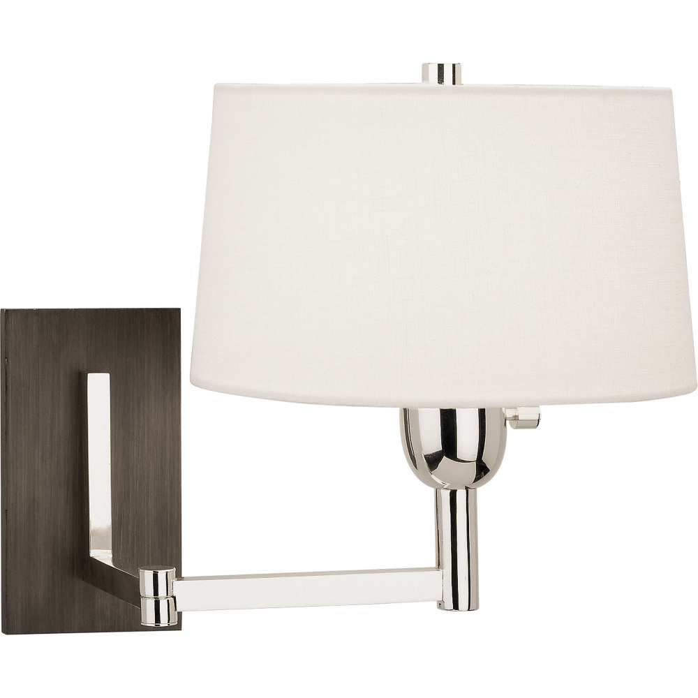 Our Wonton collection brings contemporary styled comfort and flexibility to your space. The combination of wood, metal and a streamlined design make this collection unique and versatile. - Silver Plate Finish with Weathered Ebony Finished Wood Accents Wonton Wall Swinger with Off-White Linen Shade with Rolled Edge Hem
