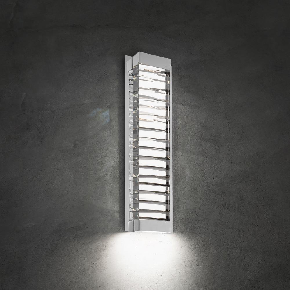 A faceted abstract design of solid Optic Crystal. Hidden LEDs illuminate the crystal internally and also provide downlight for wayfinding on this interior wall sconce.