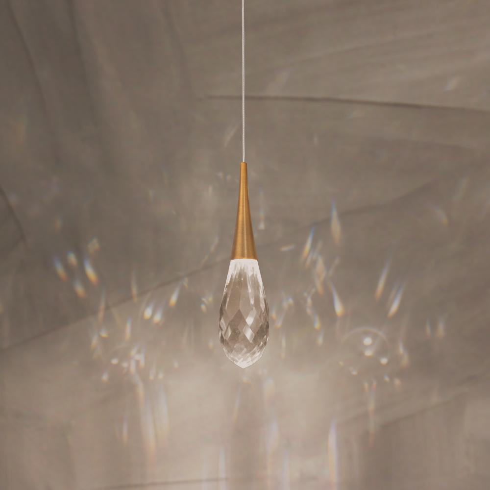Crystal fashion comes to light in unique forms. Delicate, graceful drops of exquisite crystal embraced by tapered metal forms that glow with a charming luster. A matching crystal overlays is applied to the metal canopies for an additional touch of luxury.