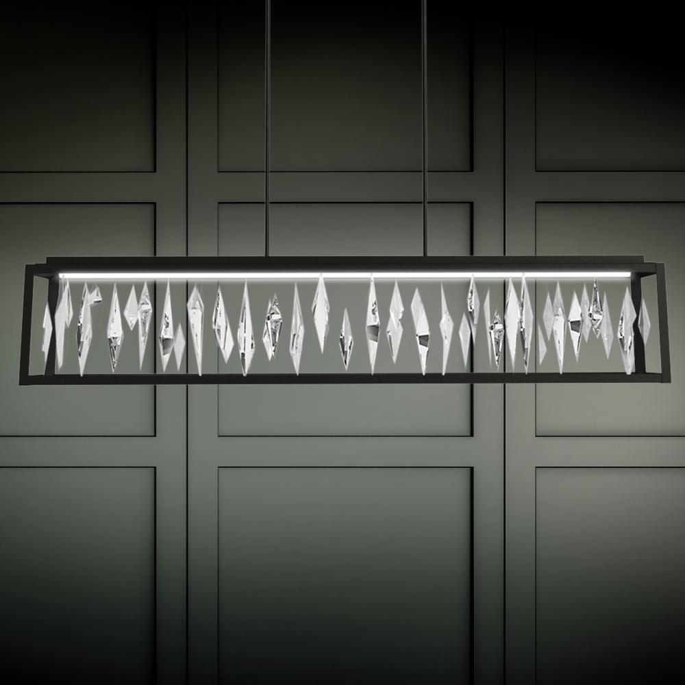 A twinkling array of suspended diamond-shaped Optic Crystals shimmer in matte black framed illumination. Beams of upward and down light illuminate the crystals in all directions for a magnificent and thought provoking effect.