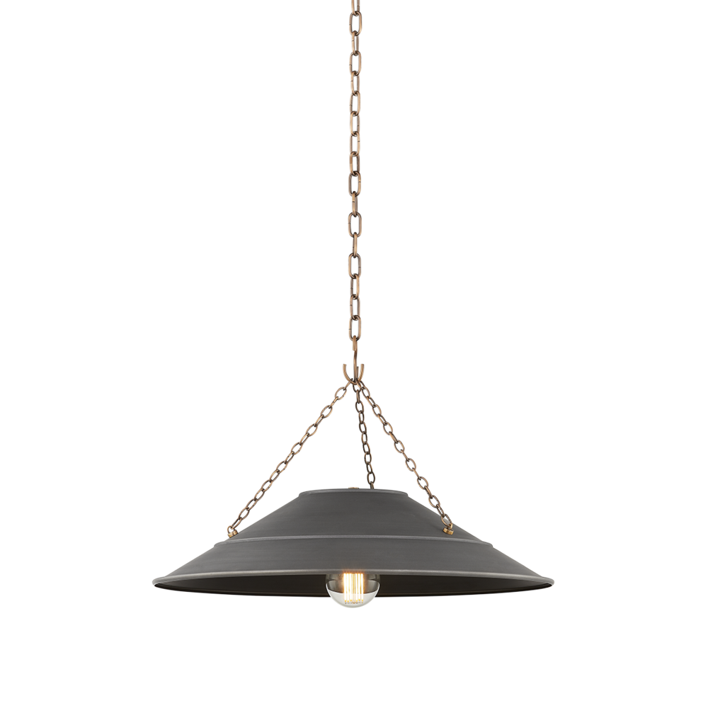 With its exposed metalwork, chain detailing, and unique finish combination, Arcane has an elevated, industrial vibe. The graphite shade feels chic and gives off a warm glow. The Patina Brass hardware, chain, and canopy add a hint of shine that plays wonderfully off the graphite. The twisted black fabric cord is a subtle detail that gives the pendant a vintage feel. Part of our Lauren Liess collection.