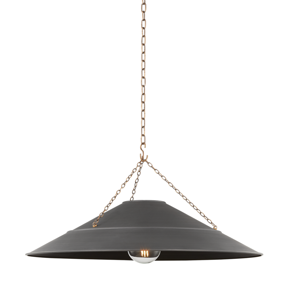 With its exposed metalwork, chain detailing, and unique finish combination, Arcane has an elevated, industrial vibe. The graphite shade feels chic and gives off a warm glow. The Patina Brass hardware, chain, and canopy add a hint of shine that plays wonderfully off the graphite. The twisted black fabric cord is a subtle detail that gives the pendant a vintage feel. Part of our Lauren Liess collection.