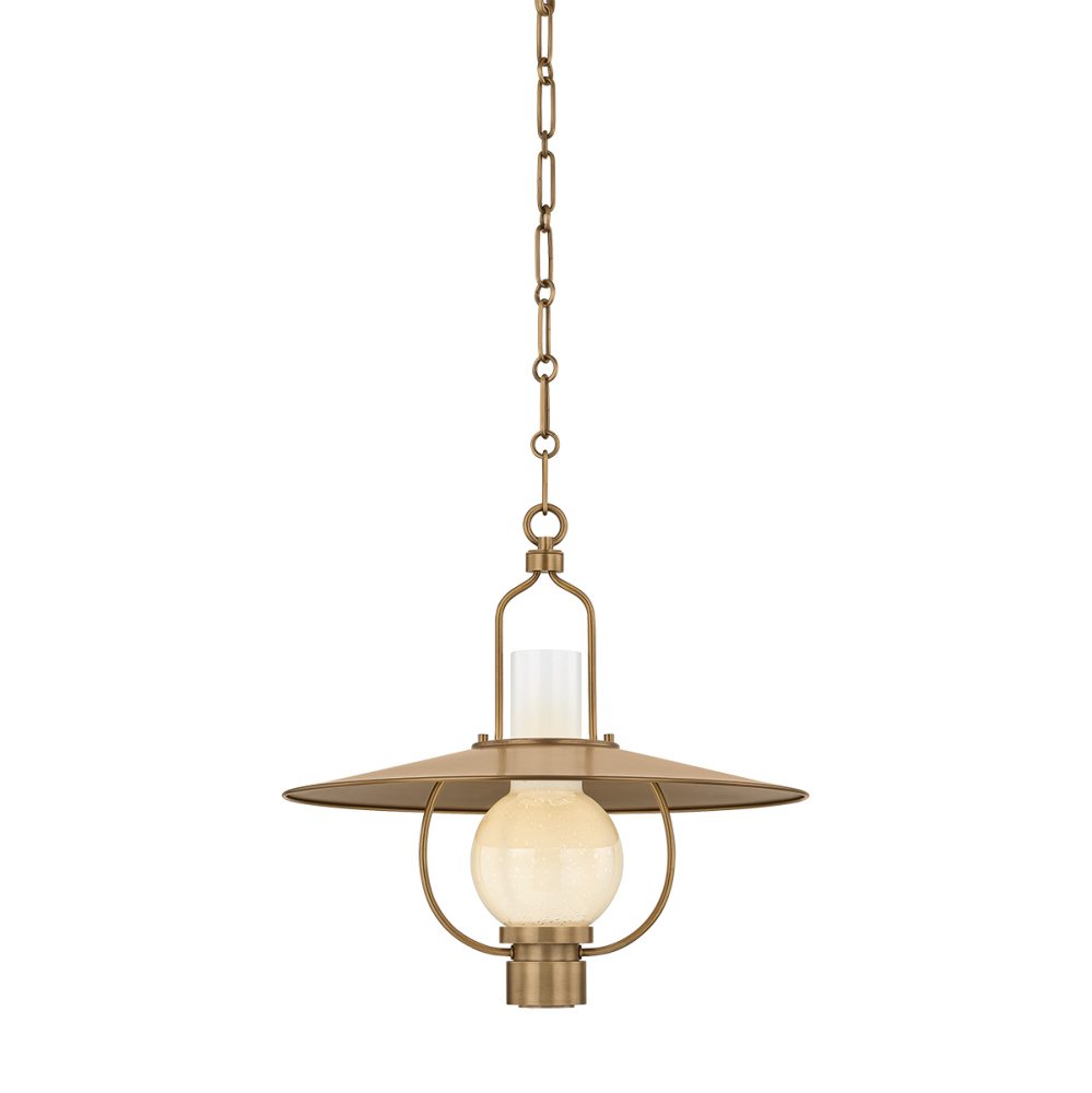 The Cahill pendant captures the clarity of peak mid-century design. A wide metal shade creates a sharp, graphic silhouette, while an opal seedy glass globe softens the form. Finished in Patina Brass, Cahill is both architectural and airy. Available in two sizes, it creates a striking focal point in kitchens, dining areas, and entryways.
