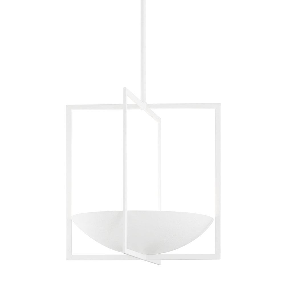 Based on simple geometric shapes, Loki gives new life to the classic cage pendant. A bowl shade rests within two interlocking rectangles that seem to suspend in midair. Light fills the bowl, flows through the open frame and reflects beautifully off the White Gesso finish. This clean, sculptural pendant fills any space with light and style.