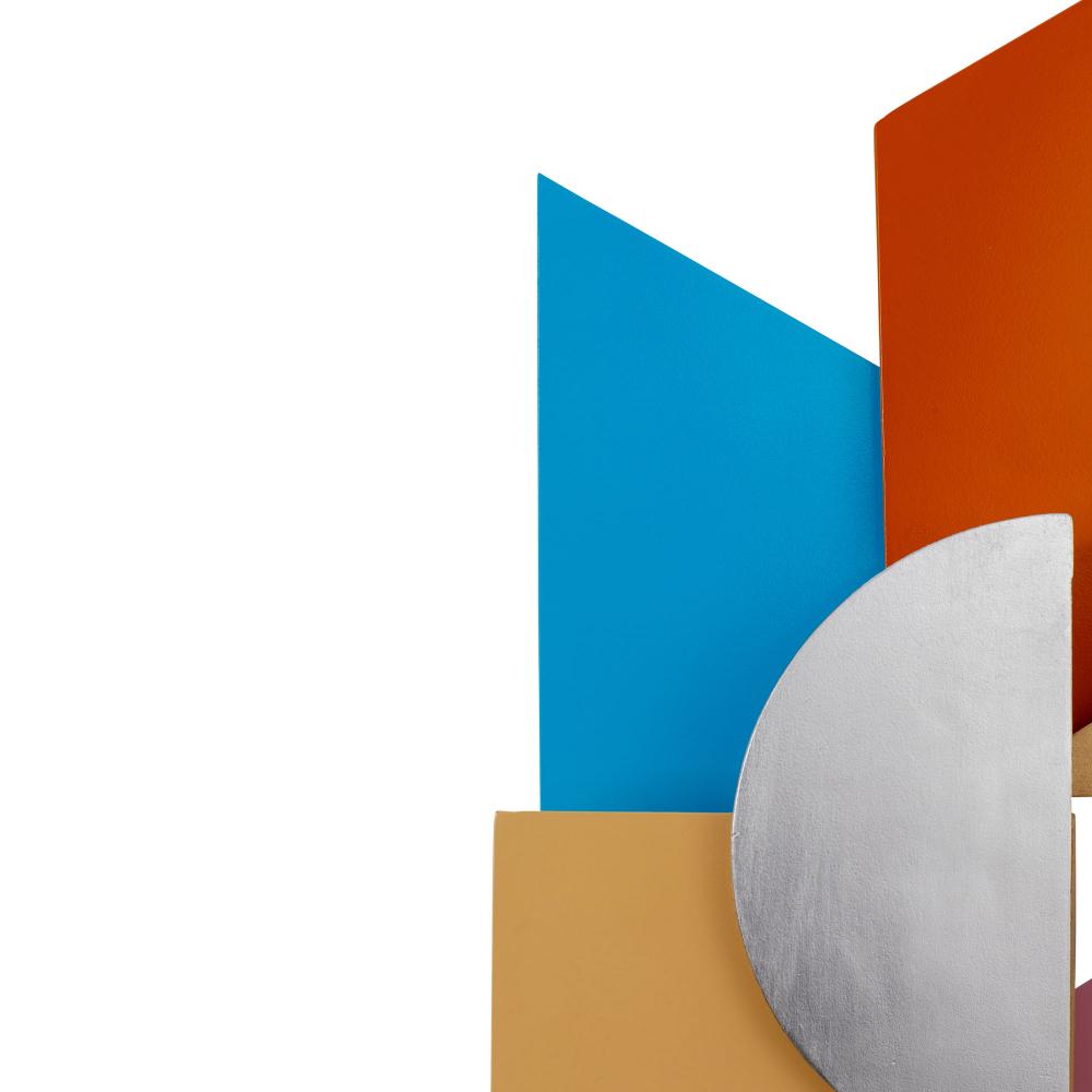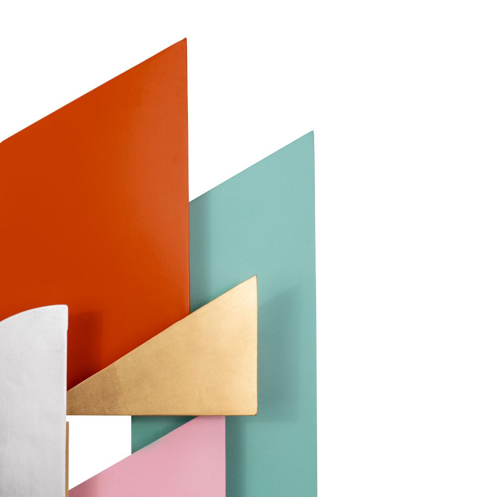 Sharing design inspiration with the Danny collection, Bette is also inspired by Miss M, and the Memphis style. Recycled steel wall sculptures in multicolor and a more ?now? blend of blacks and golds, with various textures and sheens.