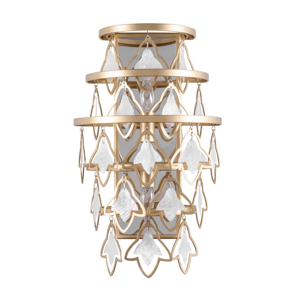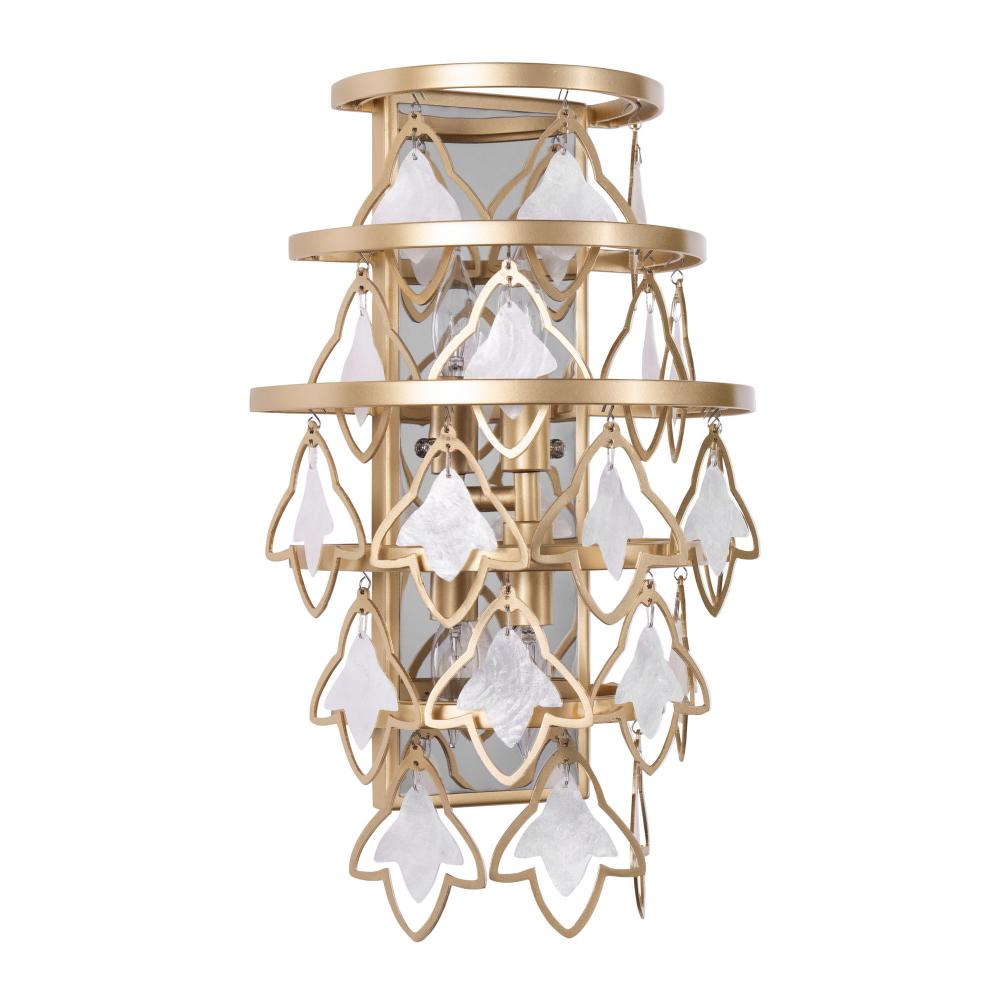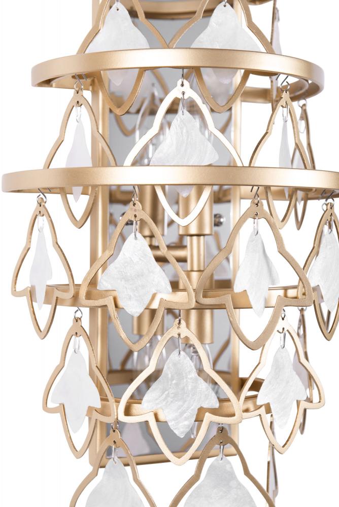 Fleur shines with inspiration from a late 19th century wallcovering housed at Cooper-Hewitt, Smithsonian Design Museum. Fleur incorporates elements reminiscent of the wallcovering's pattern of alternating, stylized, onion-top and spearhead motifs, where each one encloses a similar delicate Fleur-de-lis (Lily Flower) design. Fleur's frame builds upon the spear head motif, modernizing and simplifying the Fleur-de-lis shape as the prominent design element, which also houses a smaller Fleur-de-lis made of sustainable Capiz. Handcrafted from 70% recycled steel. Removeable top stem. Low-VOC French Gold finish.