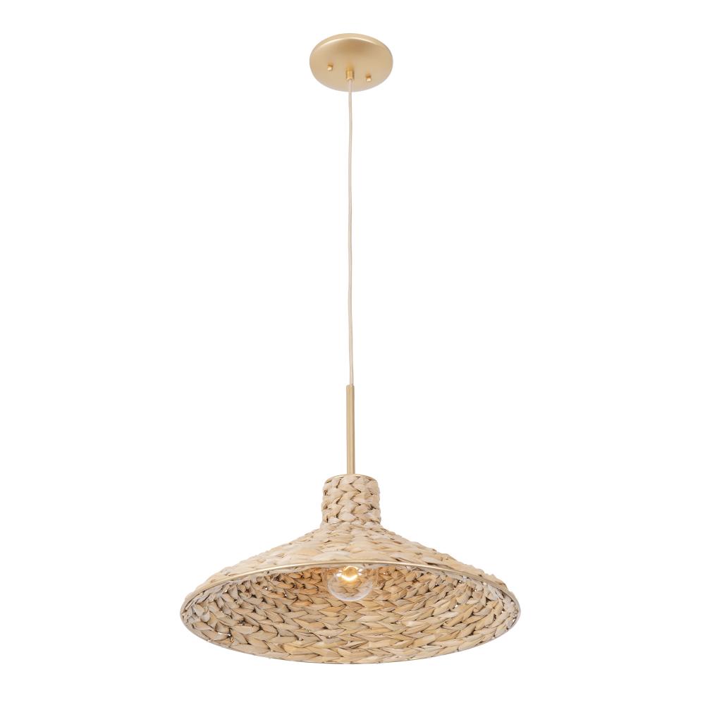 A cultural legend dating back to 2,500 - 3,000 BCE, has it that once upon a time, during a torrential downpour, a graceful goddess descended from the skies wearing a giant conical hat to shield the people from a flood of rain. In the modern day, these conical hats grace fashion runways around the world and have inspired Varaluz to adapt this look to grace the ceilings of today's homes. Hilton Head features a French Gold hand-painted, multi-layered finish and hand-woven, natural, sealed seagrass.