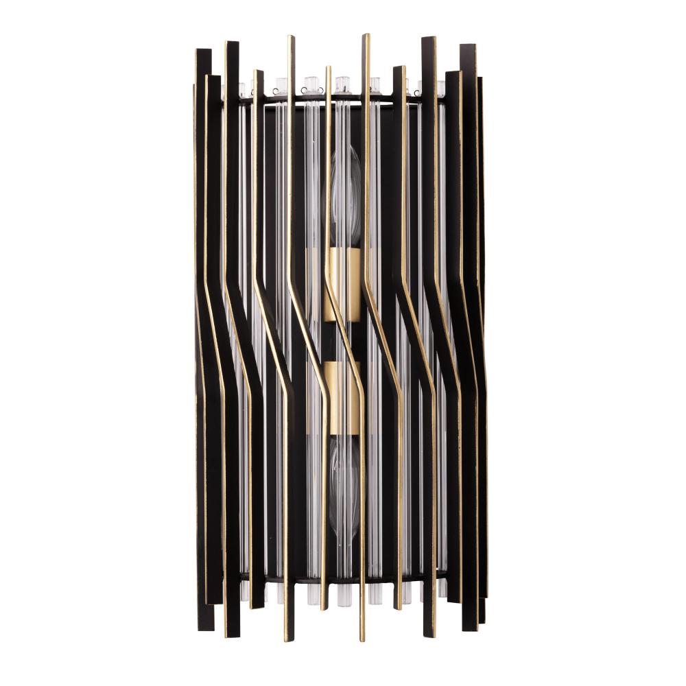 Inspired by the elements of New York City's Brooklyn Bridge as depicted in an illustration found in Smithsonian American Art Museum, the Park Row collection is sure to bridge the gap between functionality and inspired design. The Brooklyn Bridge's neo-Gothic stone towers support a hybrid cable-stayed/suspension bridge design, with both vertical and diagonal suspender cables, which are the inspiration for Park Row. The interwoven cables create a repeating pattern that we have wrapped around and support modern clear fluted, recycled glass rods. The collection is hand-forged from 70% recycled steel. Hand-finished in matte black with French Gold edges.