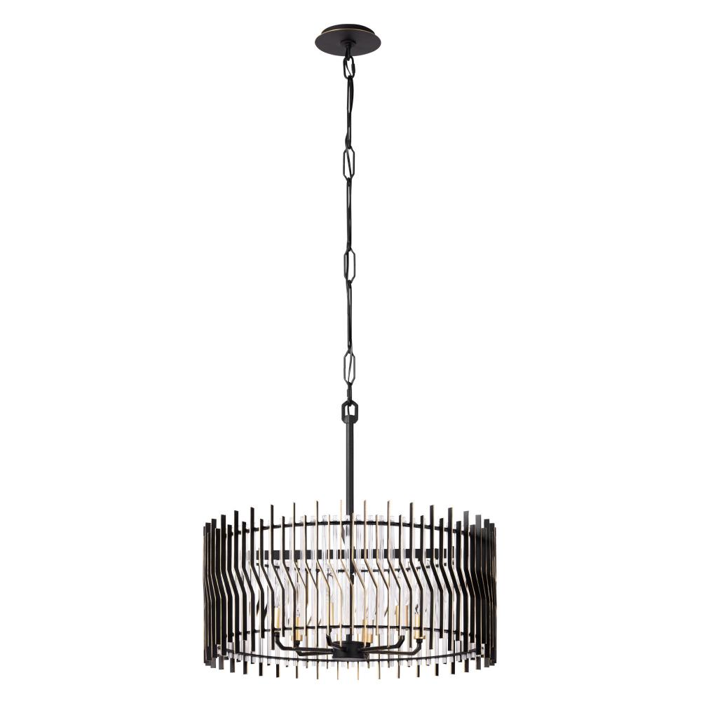 Inspired by the elements of New York City's Brooklyn Bridge as depicted in an illustration found in Smithsonian American Art Museum, the Park Row collection is sure to bridge the gap between functionality and inspired design. The Brooklyn Bridge's neo-Gothic stone towers support a hybrid cable-stayed/suspension bridge design, with both vertical and diagonal suspender cables, which are the inspiration for Park Row. The interwoven cables create a repeating pattern that we have wrapped around and support modern clear fluted, recycled glass rods. The collection is hand-forged from 70% recycled steel. Hand-finished in matte black with French Gold edges.