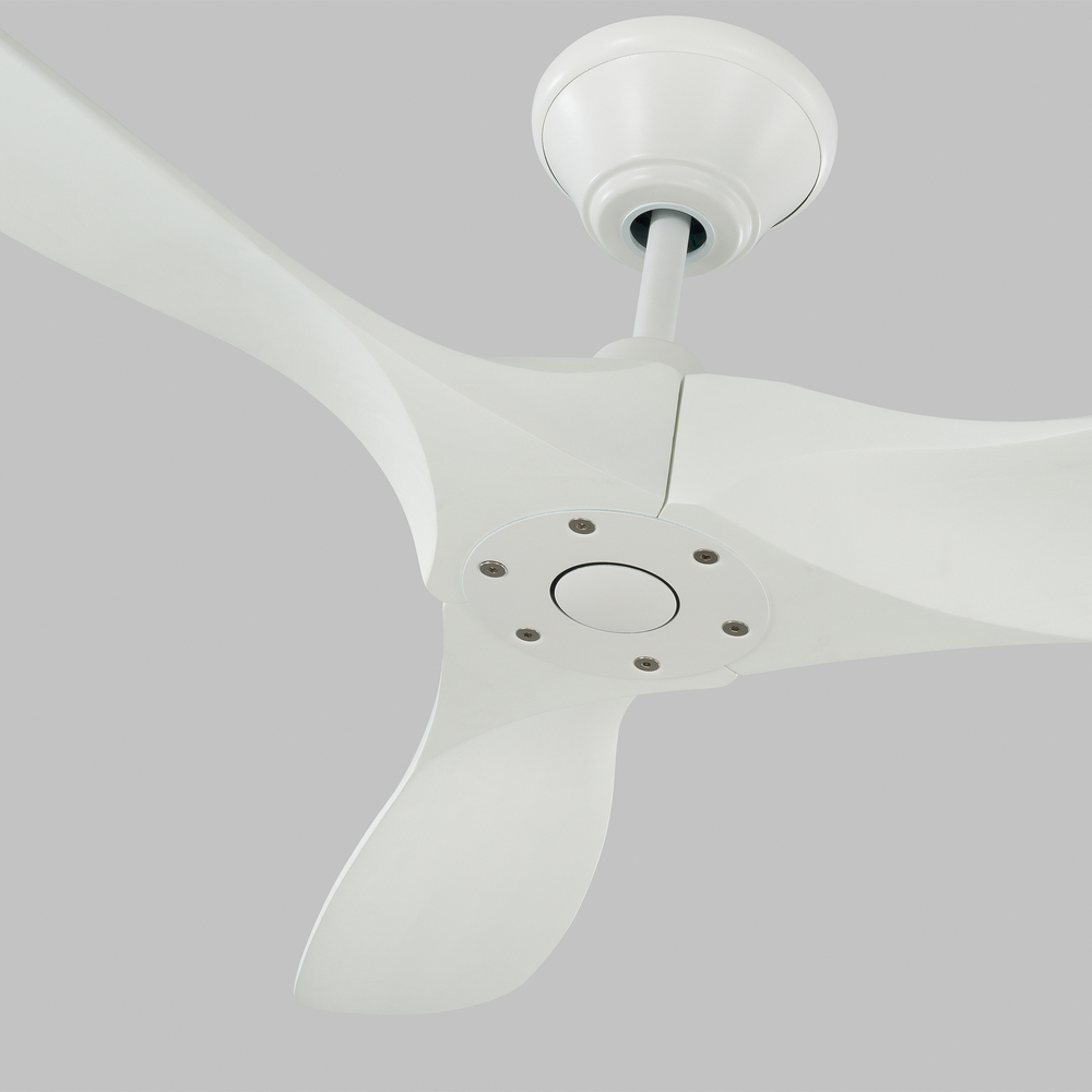 The Maverick 52 in Matte White features an 85.0 X 28.0 6-speed motor with a Thirteen-degree blade pitch. With a sleek modern silhouette, a DC motor, and super energy-efficiency, the 52" Maverick II ceiling fan features softly rounded blades and elegantly simple housing. Maverick has a 52-inch blade sweep and a 3-blade design that delivers a distinct profile and incredible airflow for living rooms, great rooms, or outdoor covered areas. It includes a hand-held remote with six speeds. It reverses and is available in six distinct finish options: Brushed Steel housing with Dark Walnut blades, Brushed Steel housing with Koa blades, Matte Black housing with Dark Walnut Blades, Aged Pewter housing with Light Grey Weathered Oak blades, Matte Black housing with Matte Black blades and Matte White housing with Matte White blades. All versions feature beautiful hand-carved balsa wood blades. ENERGY STAR qualified. Maverick fans are damp-rated and may be used indoors and in covered outdoor spaces.