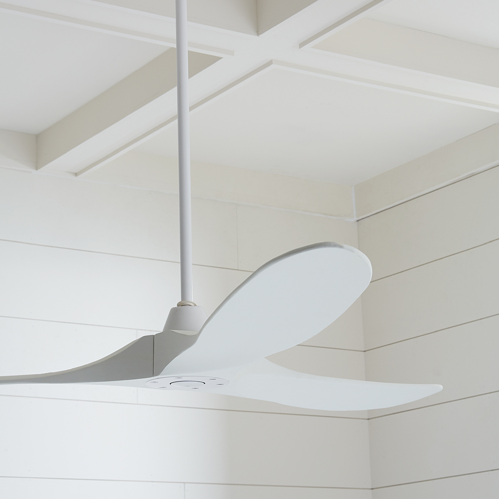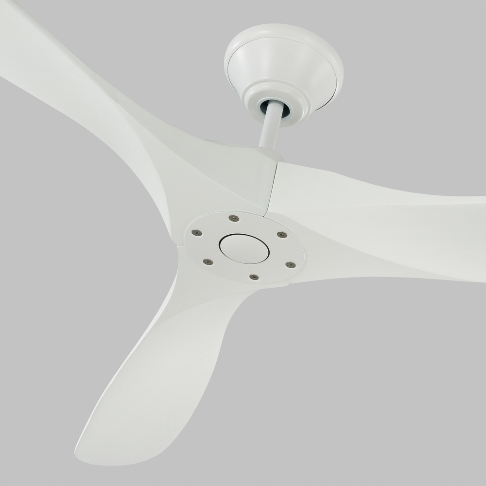 The Maverick 60 in Matte White features an 85.0 X 28.0 6-speed motor with a Thirteen-degree blade pitch. With a sleek modern silhouette, a DC motor, and super energy-efficiency, the 60" Maverick ceiling fan features softly rounded blades and elegantly simple housing. Maverick has a 60-inch blade sweep and a 3-blade design that delivers a distinct profile and incredible airflow for living rooms, great rooms, or outdoor covered areas. It includes a hand-held remote with six speeds. It reverses and is available in six distinct finish options: Brushed Steel housing with Dark Walnut blades, Brushed Steel housing with Koa blades, Matte Black housing with Dark Walnut Blades, Aged Pewter housing with Light Grey Weathered Oak blades, Matte Black housing with Matte Black blades and Matte White housing with Matte White blades. All versions feature beautiful hand-carved balsa wood blades. ENERGY STAR qualified. Maverick fans are damp-rated and may be used indoors and in covered outdoor spaces.